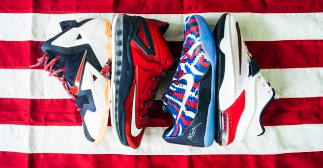 Le championnat du monde de basketball aura lieu au mois de septembre 2014 en Espagne. Cet événement accueillera les plus grandes nations du basketball avec notamment Team USA. Les Etats-Unis débuteront la compétition avec le statut de grand favori au vu des joueurs sélectionnés par Coach K. Parmi ces derniers on retrouve différents joueurs dont l’équipementier est Nike (excepté Kobe Bryant). La marque au swoosh profite de l’occasion pour concevoir une nouvelle déclinaison des modèles signatures de Kobe Bryant, Lebron James et Kevin Durant. Ce Nike Basketball « USA » pack été 2014 se compose de quatre paires de sneakers, Lebron 11, Lebron 11 Max Low, Kobe 9 EM et KD VII qui sont toutes aux couleurs des Etats-Unis.