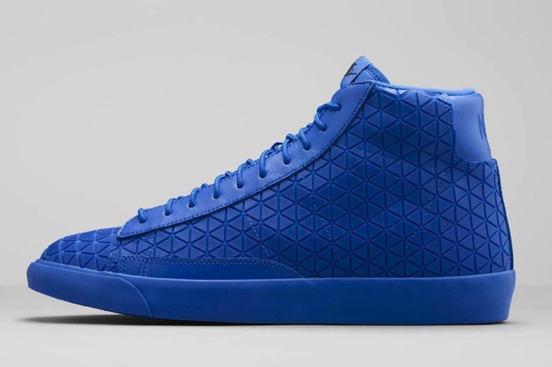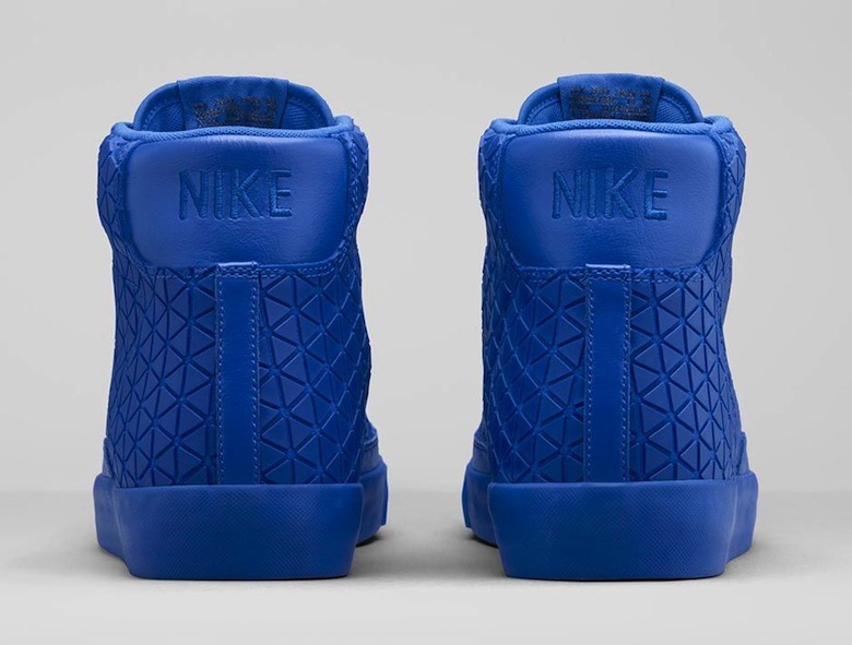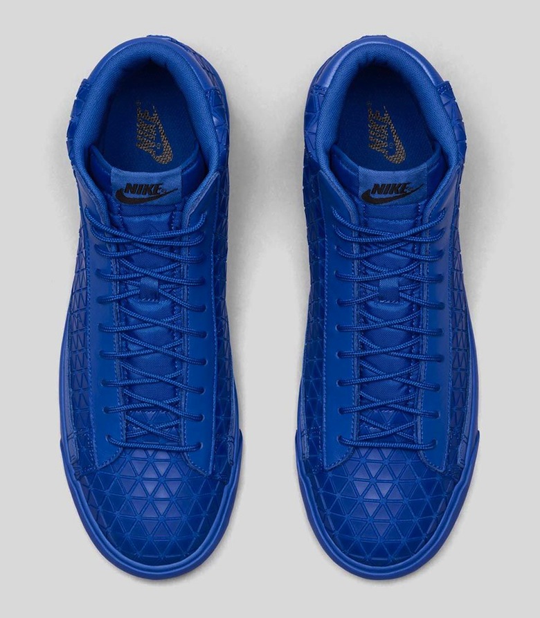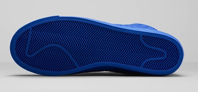 La paire de sneakers arbore une empeigne entièrement réalisée à partir du coloris « Royal Blue » dans un design atypique avec ces petits triangles en plastique complétés par plusieurs empiècements en cuir notamment visibles au niveau des oeillets et du talon. Les amateurs du modèle remarqueront que la semelle extérieure est vulcanisée et que le swoosh, normalement présent sur les panneaux extérieurs, a été retiré pour un look plus discret et plus élégant.