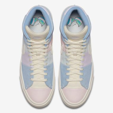 Pâques oblige, la chaussure fait la part belle aux couleurs pastel bleu, mauve et rose pour son empeigne. En complément, le Swoosh blanc se fond dans le design et fait écho aux lacets de même couleur. La sneaker a d’ailleurs été conçue dans plusieurs pièces de suede et de cuir tout comme sa consœur qui sortira au même moment. Un empiècement en mesh rigide a été apposé sur l’ensemble de la languette. On retrouve également une semelle vulcanisée comme le veut la construction de la Blazer. La paire est également proposée dans sa version haute. La présence du logo sur la semelle de confort ne laisse aucun doute quant à la thématique et confirme le lien de parenté avec la paire d’Air Force 1 : il s’agit d’un œuf de Pâques multicolore cassé associé à un Swoosh.