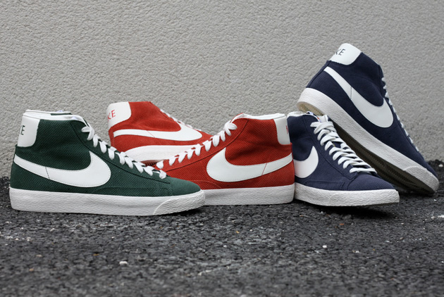 Nike continue de décliner sa Nike Blazer Vintage avec de nouveaux types de matériaux. Pour sa saison « Fall 2013 », la marque a décidé d’appliquer un cuir suédé perforé sur son modèle basketball 70’s. Chaque paire est proposée dans un coloris uni : bleu marine, vert ou orange avec la virgule blanche.