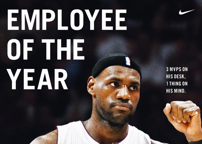 Afin de célébrer le titre MVP de Lebron James, Nike a essayé d’imaginer à quoi pourrait ressembler le trophée MVP et a surnommé le basketteur « Employee of the Year ». La publicité montre ce que Lebron n’a eu de cesse de dire – c’est un homme en mission, concentrer sur son équipe et sur l’obtention de son premier titre en NBA. Nike salue également son troisième titre de MVP en sortant une édition spéciale de la Nike LEBRON 9. La Nike LEBRON 9 MVP reprend les couleurs de son équipe, le Miami Heat. Cette sneaker est un dégradé de rouge et de noir avec quelques touches de jaune. Le trophée de MVP que Nike a imaginé est quant à lui imprimé sur la semelle intérieur tandis que le logo « MVP » est appliqué sur le talon. Cette sneaker a été réalisée spécialement pour Lebron James, mais quelques paires en quantité très limitée seront mises en vente le mois prochain.