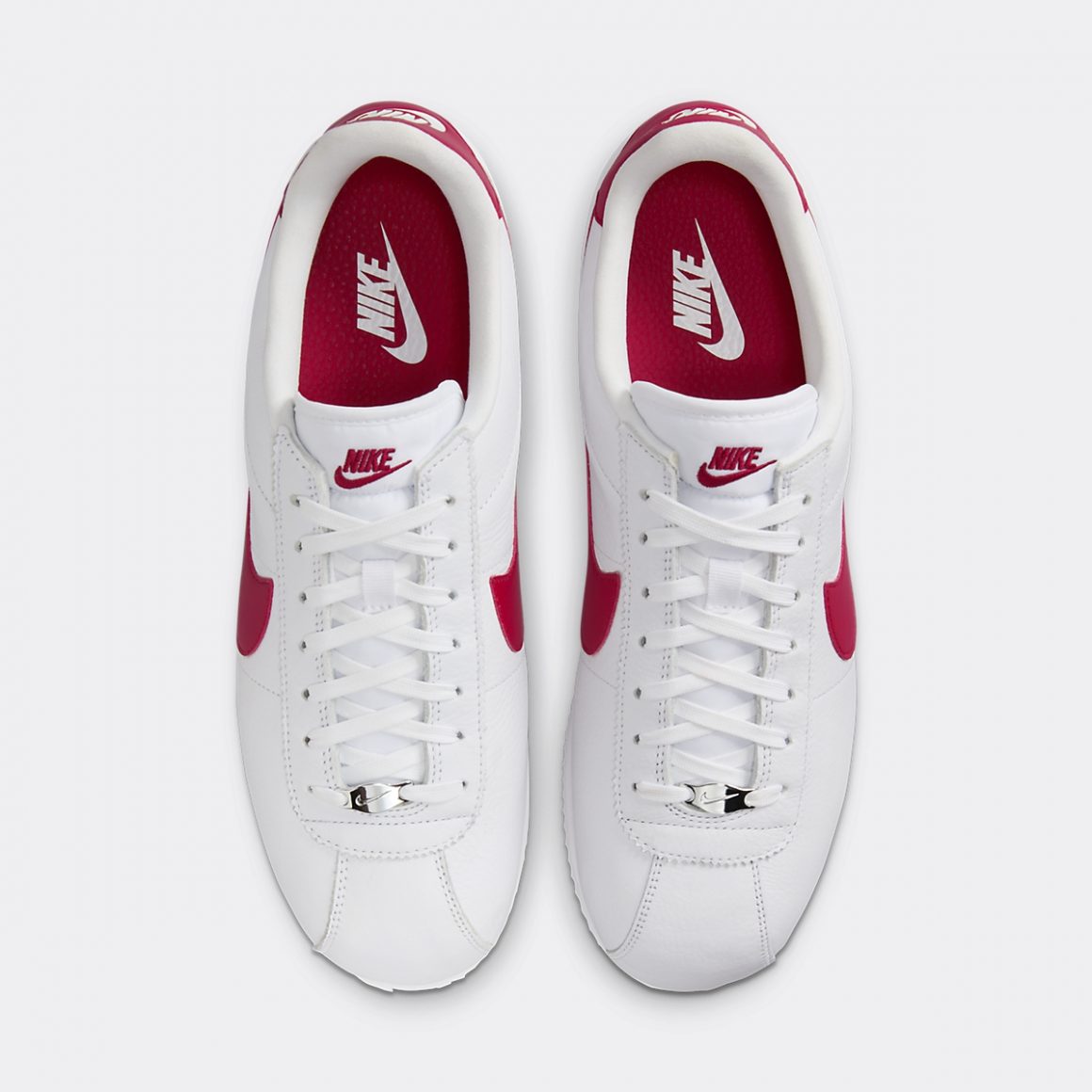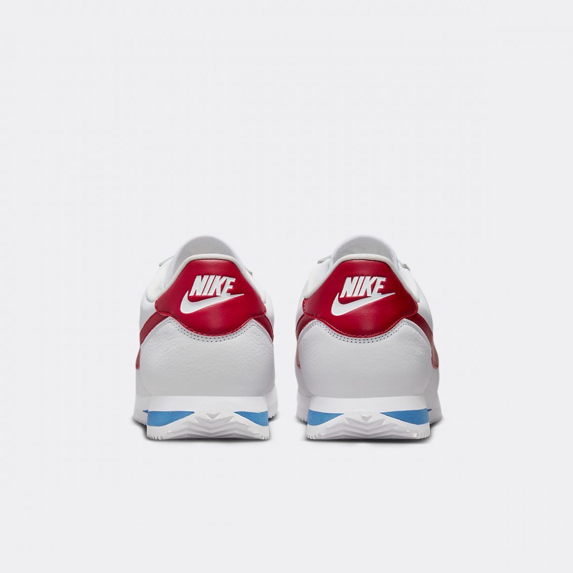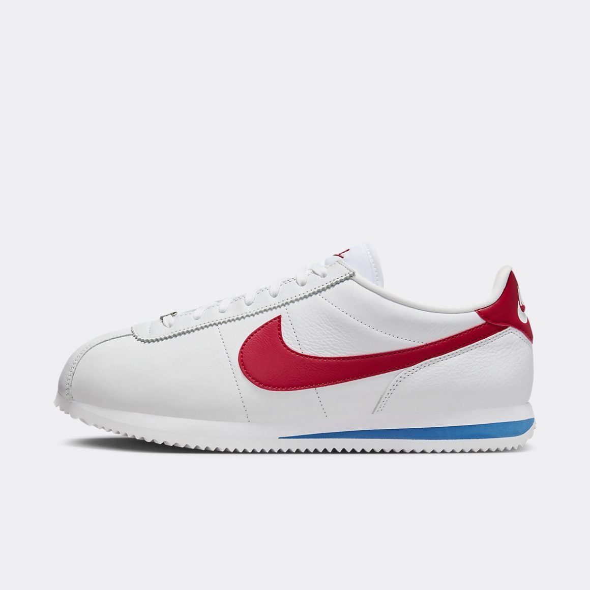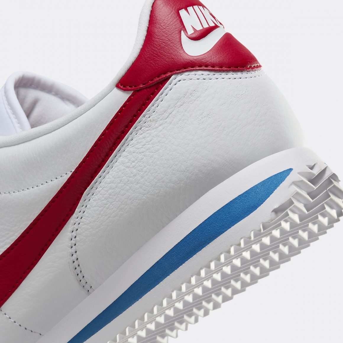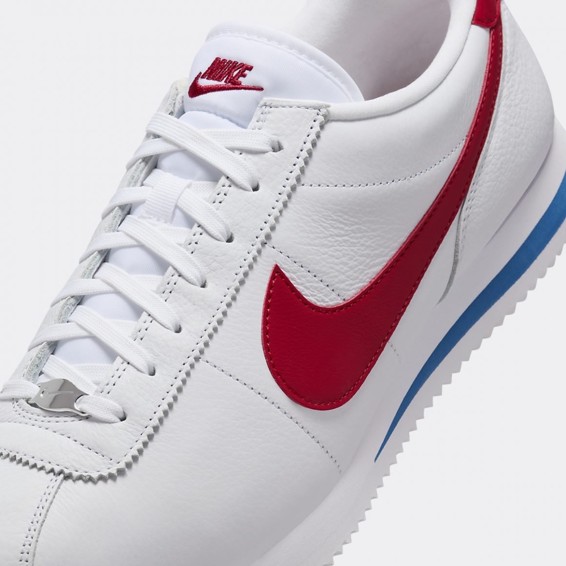 La réédition 2024 de la Nike Cortez Forrest Gump reprend le design de 1972. Sa silhouette unique s’habille de cuir blanc, ornée de coutures ton sur ton. Ce cuir se marie au tissu du sockliner, ainsi qu’au Nylon de la languette. Son sommet est brodé d’un logo Nike rouge, assorti aux Swoosh latéraux. Le heeltab rouge est gaufré d’un logo Nike blanc. La base des lacets plats blancs porte un deubré argent, serti d’un mini Swoosh. La paire repose sur une semelle intermédiaire immaculée, liserée de bleu sur le quart arrière. Une semelle extérieure blanche finalise ce design classique de Nike.