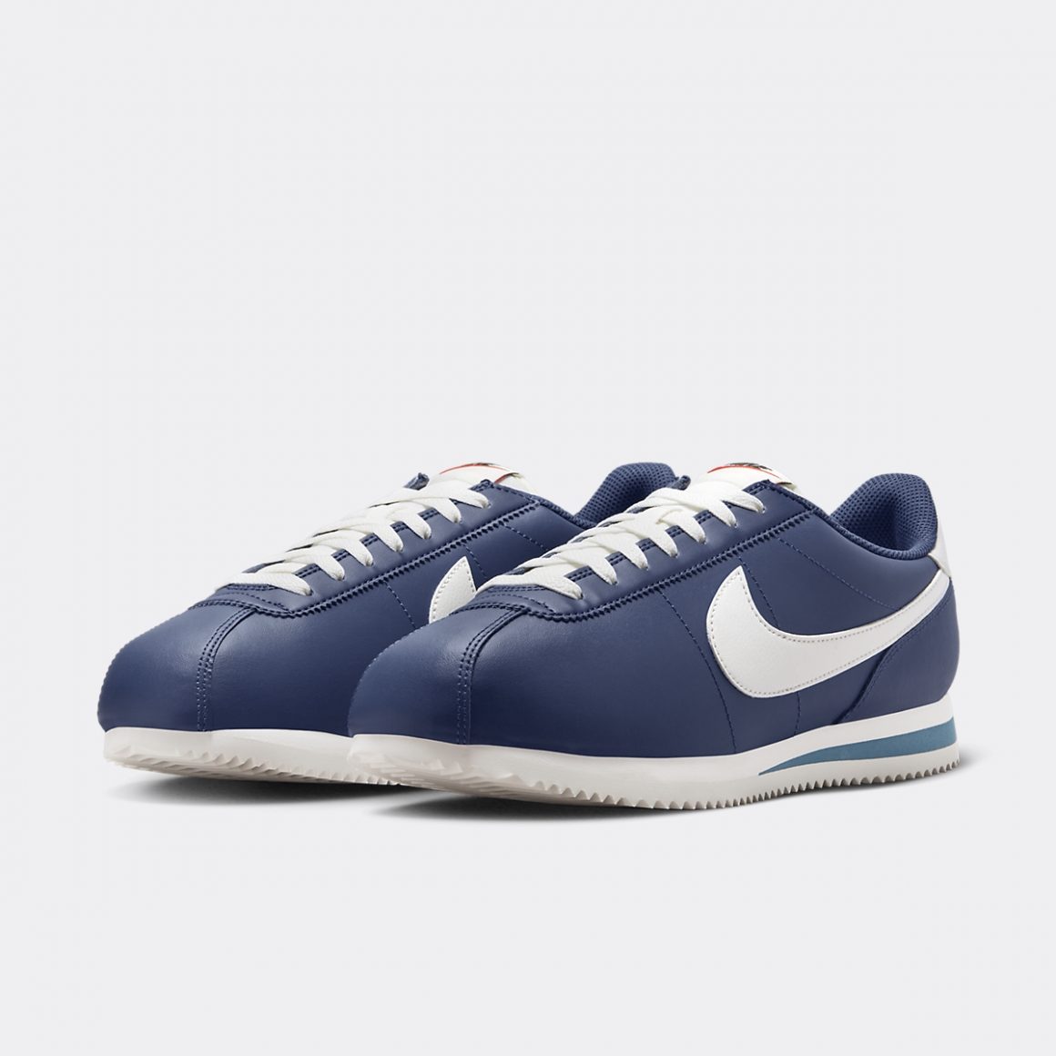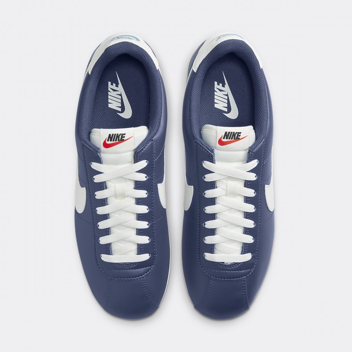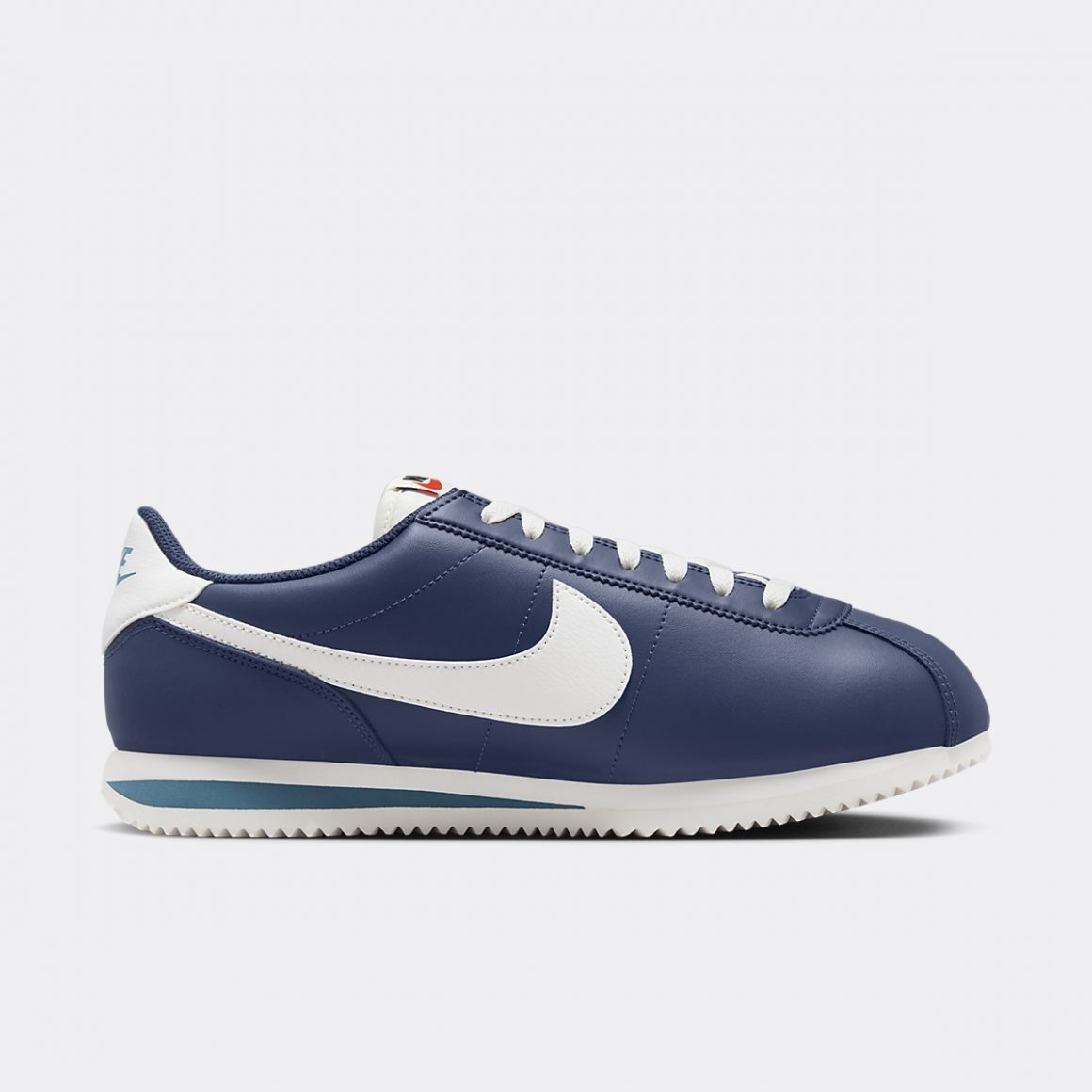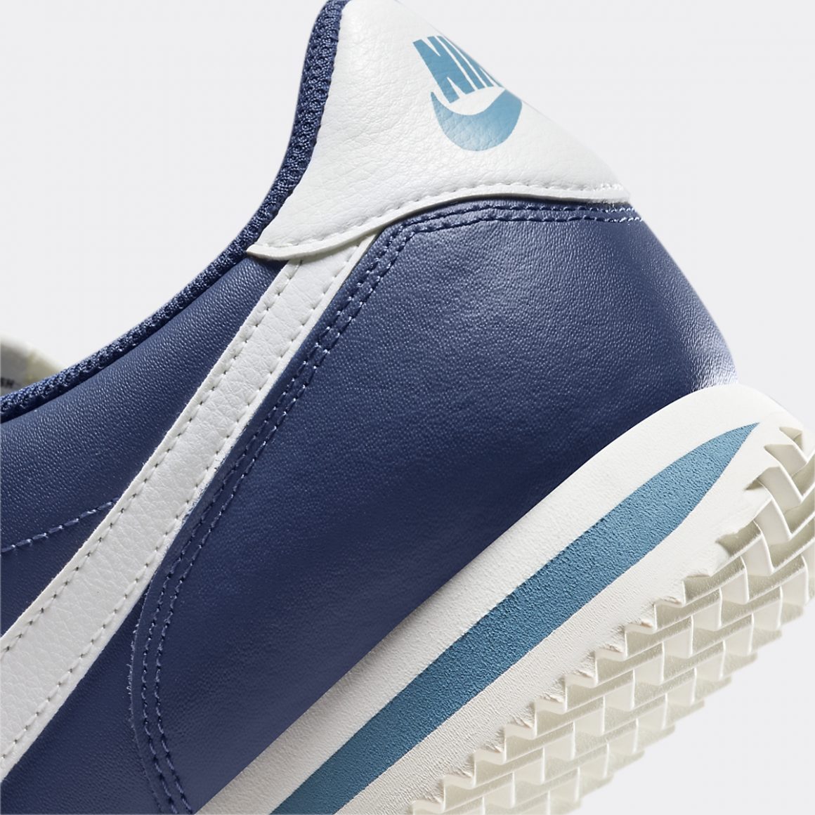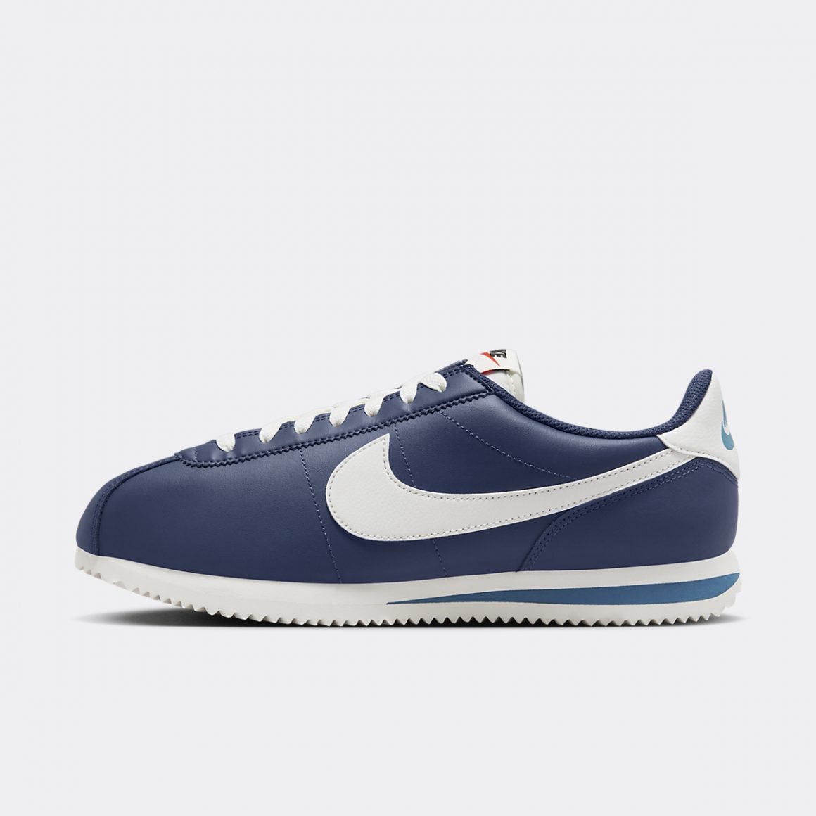 Le design de la Nike Cortez se caractérise par un équilibre harmonieux alliant savamment simplicité et fonctionnalité. L’empeigne de la Nike Cortez Midnight Navy est construite en cuir marine, assurant durabilité et confort. Les lignes épurées et la forme classique de la sneaker contribuent à son attrait intemporel, tandis que l’imposant Swoosh latéral blanc ajoute le branding distinctif de la firme de l’Oregon. La languette en Nylon est immaculée et porte une étiquette au logo Nike bicolore vintage. Le heeltab en cuir blanc est imprimé d’un logo Nike bleu clair, rappelant le liseré arrière de la semelle intermédiaire. Cette dernière est en mousse blanche et repose sur une semelle extérieure assortie à chevrons, reflétant ses origines athlétiques.