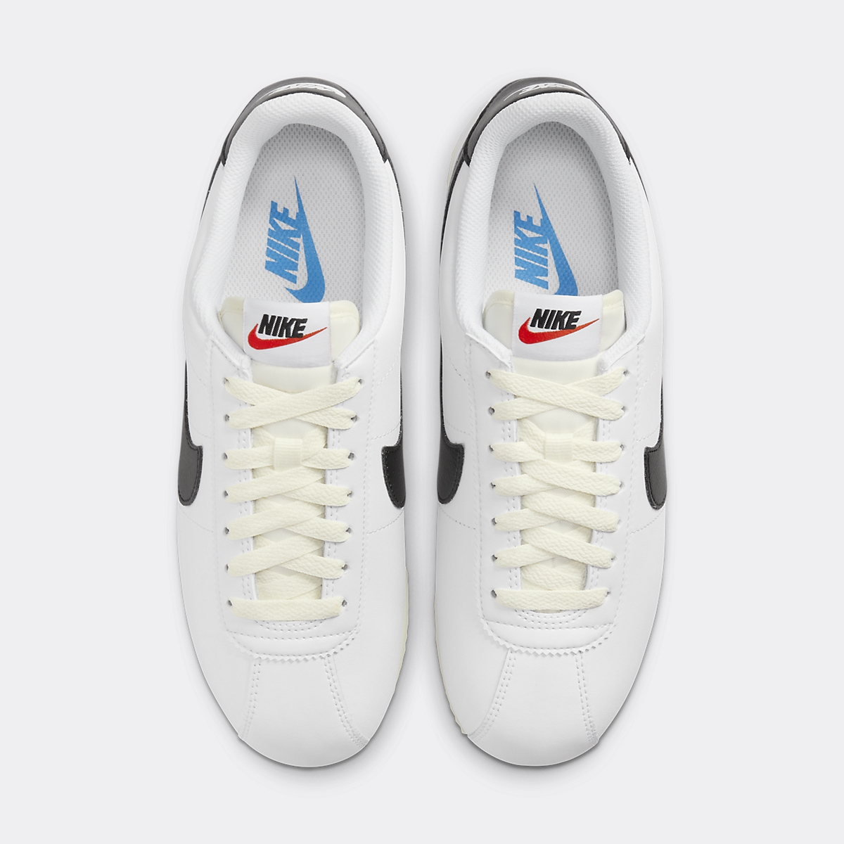 La collection Nike Cortez Spring 2023 s’ouvre sur un coloris White Black Blue. Rappelant la construction du coloris original, son empeigne se pare de cuir blanc lisse, ainsi que de coutures ton sur ton. La languette en Nylon est légèrement jaunie, à l’instar des lacets plats, et porte à son sommet une étiquette au logo Nike vintage. Le heeltab en cuir noir se marie à l’imposant Swoosh latéral. La paire repose sur une semelle blanc cassé, traversée par un trait bleu électrique.