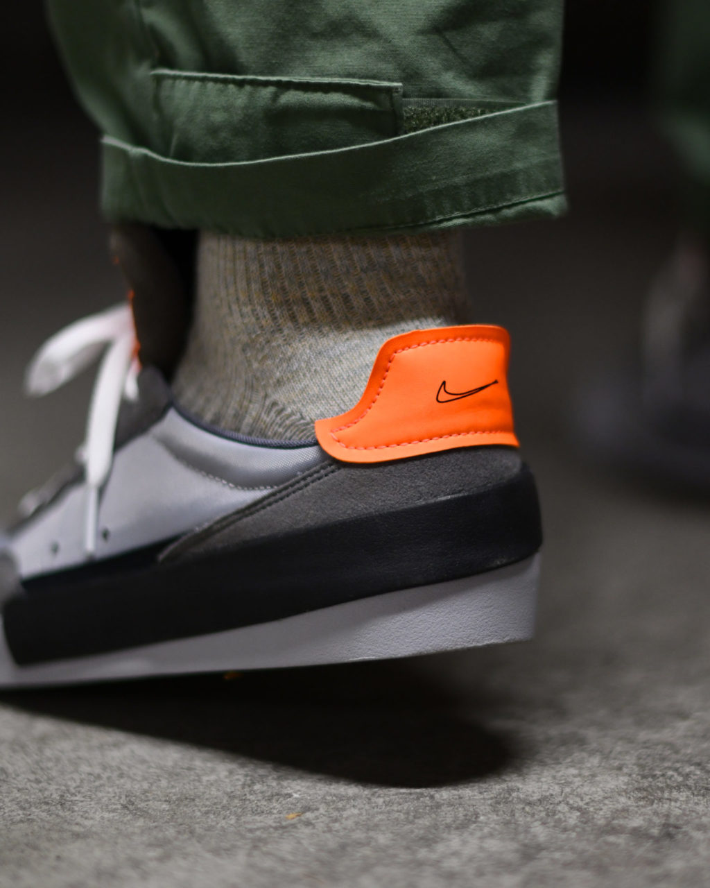 Très largement inspirée de la classique Nike All court II, la Nike Drop Type a pour ambition de remettre cette icône des courts de tennis au goût du jour. Pour cela, Nike continue à exploiter le filon de la deconstruction. Sur une empeigne gris clair en tissu, les designers de Nike on ajouté des empiècements en cuir suédé gris foncé, dont un sur le côté avant avec un mini swoosh en relief ton sur ton. Le même empiècement habille le passage des lacets et la partie inférieure du talon. Ce dernier est surmonté d’une languette en cuir orange vibrant. Ce même orange habille la languette rembourrée de mousse et ornée d’un swoosh dessiné à la main. C’est cette graphie que l’on peut retrouver sur le côté de la paire en lieu et place de l’habituel swoosh pour signer la paire du nom de la collection « N. 354 ». La semelle vulcanisée est doublée à l’avant et un empiècement noir en caoutchouc la renforce en s’enchevêtrant sur l’empeigne. D’autres détails intéressants se retrouvent sur la Drop Type, comme une semelle intérieure des plus originales ou un double maintien de lacets sur la languette.