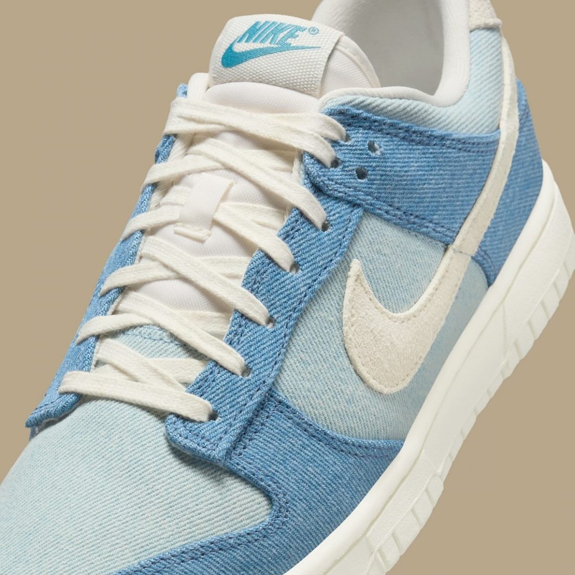 La Nike Dunk Low Denim 2025 se distingue immédiatement par son empeigne entièrement réalisée en denim de haute qualité. Contrairement aux versions classiques qui jouent souvent sur des contrastes de matériaux comme le cuir lisse ou le nubuck, ici le denim est roi et offre une texture brute mais raffinée. La toebox et les panneaux latéraux se parent de denim clair, tandis que du denim plus foncé habille les gardes-boue et les passages de lacets. Ceux-ci portent des lacets plats crème, assortis à la languette, ainsi qu’au cuir suédé du Swoosh latéral et du heeltab. Ce dernier est brodé d’une inscription Nike bleue, rappelant le logo Nike au sommet de la languette. La paire repose sur une semelle immaculée, finalisant cette nouvelle déclinaison d’un classique de la firme de Beaverton.
