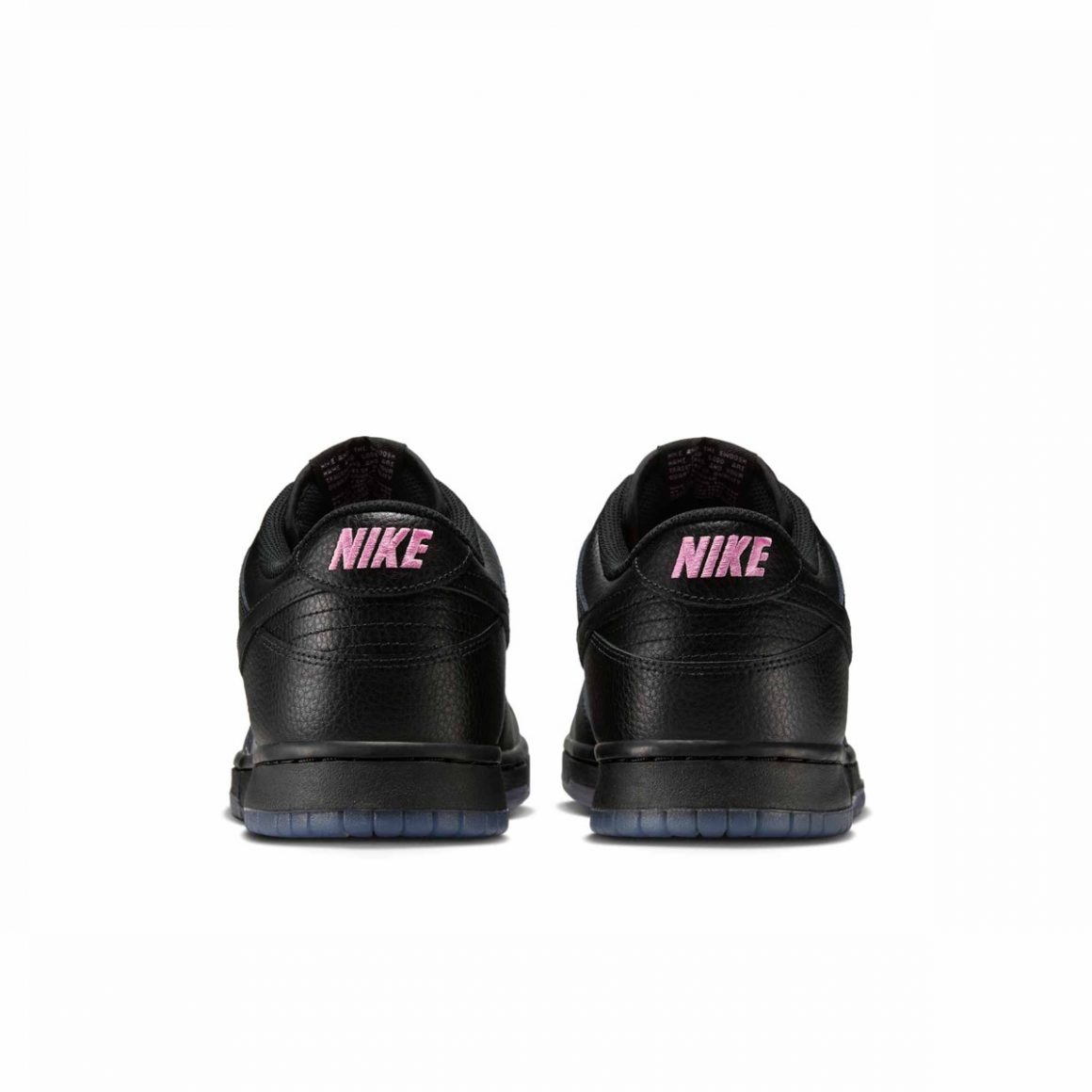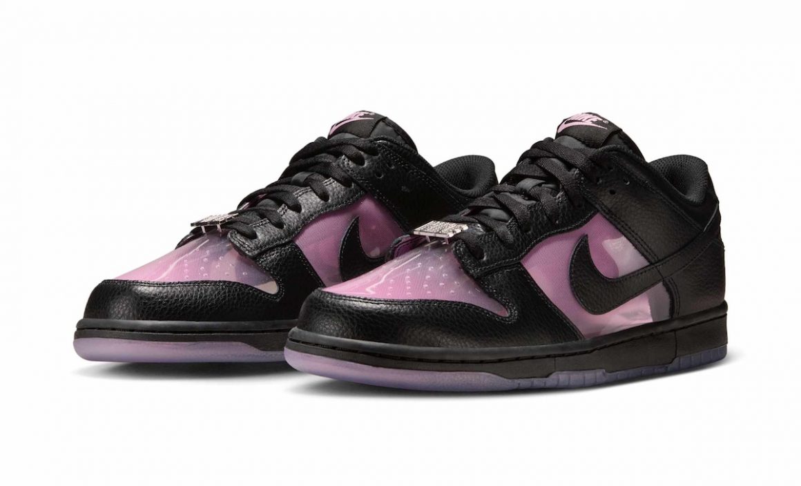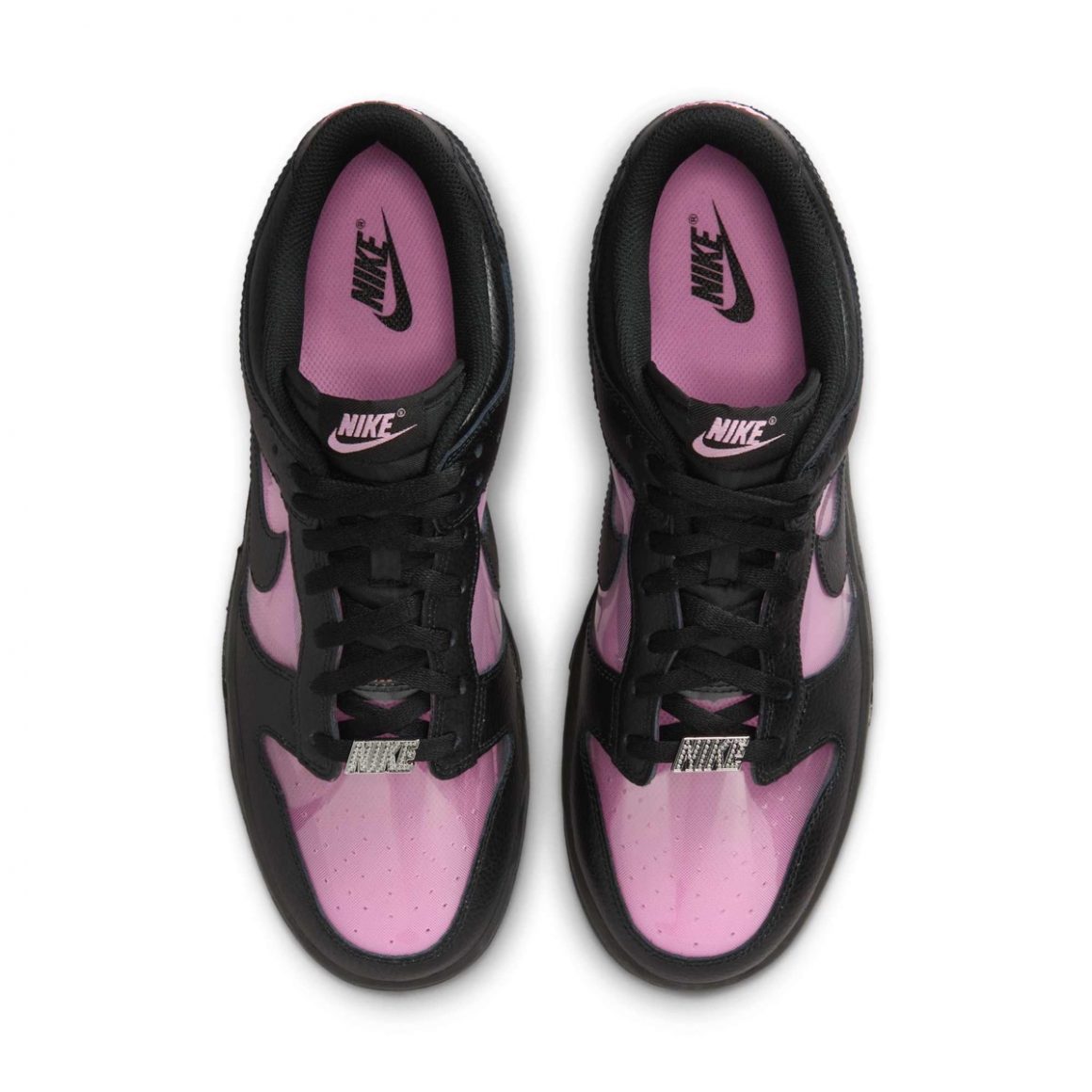 La première chose qui frappe dans cette Nike Dunk Low Pink Rise, c’est l’emploi de panneaux transparents aux sections stratégiques que sont la toebox et les panneaux latéraux. Cette approche, rarement utilisée sur une Dunk Low, introduit une esthétique vivante : l’intérieur rose apparaît en filigrane, comme un souffle coloré sous un voile de noir. Ce coloris est porté par empiècements en cuir sur les garde-boues, les passages de lacets et les Swoosh latéraux. La languette assortie est surmontée d’un logo Nike rose, et sa base porte un deubré Nike en strass. La paire repose sur une semelle intermédiaire noire, ainsi que sur une semelle extérieure translucide légèrement rosée.