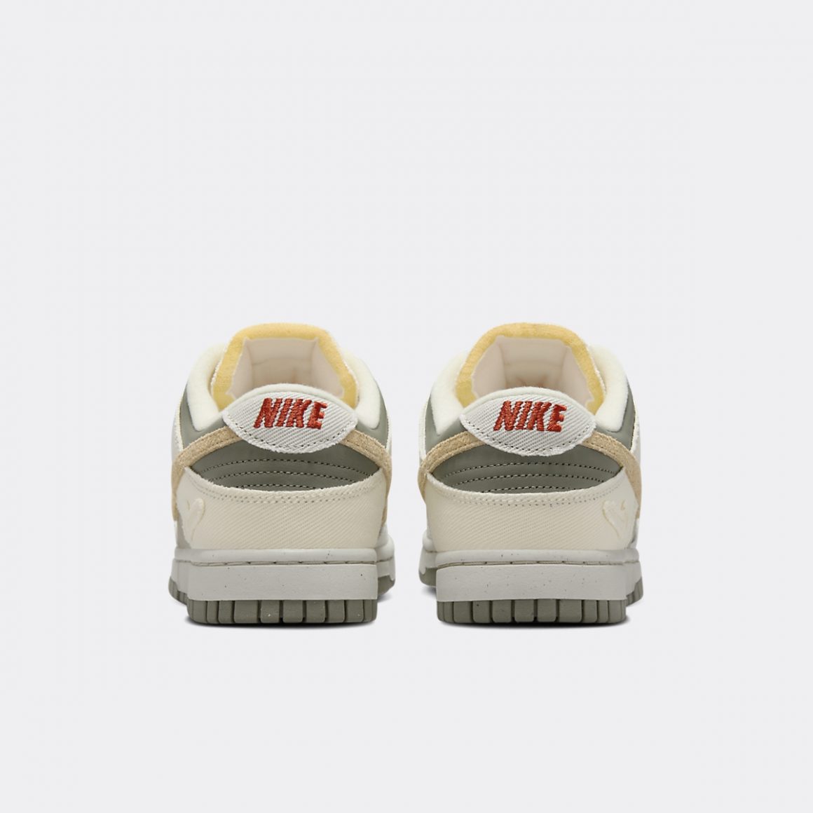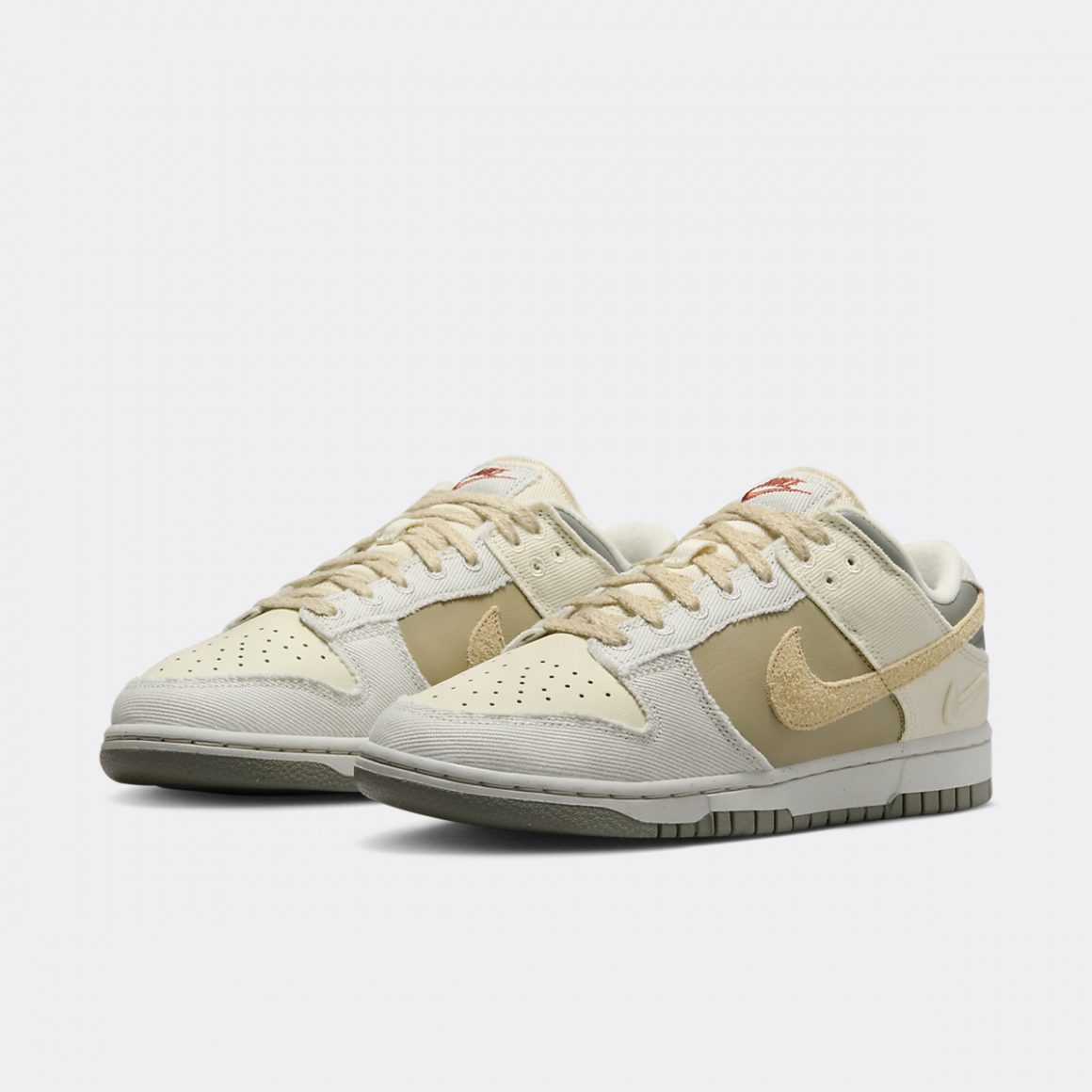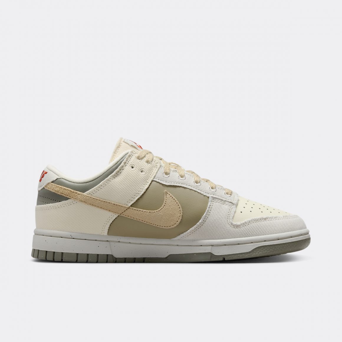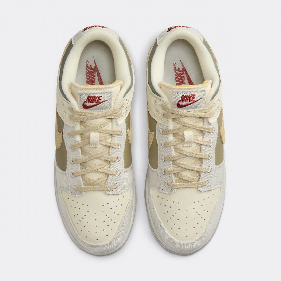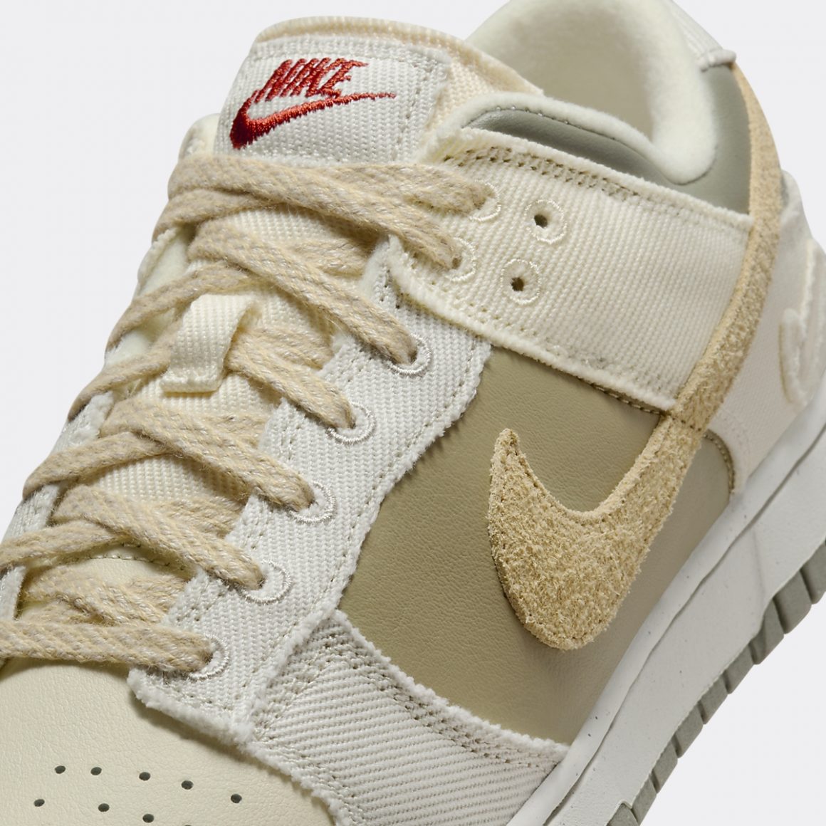La Nike Dunk Low Sesame Alabaster affiche la silhouette basse du modèle de 1985. Sa toebox perforée est en cuir crème et se marie à la languette en mousse, habillée de toile. Ce ton et cette matière habillent le garde-boue arrière, qui est serti d’un mini Swoosh ton sur ton. Les passages de lacets et le garde-boue avant apportent une légère nuance avec du canvas blanc cassé. Les panneaux latéraux en cuir kaki portent des Swoosh latéraux en cuir suédé beige. Ils sont assortis aux lacets plats et contrastent avec le col de cheville olive. Pour relever cette palette chromatique, qui rappellera à certains celle de la Air Jordan 1 Low Travis Scott, des inscriptions Nike rouges sont brodées au sommet de la languette, ainsi qu’au talon. Un autre logo Nike rouge est imprimé sur la semelle intérieure blanche. La paire repose sur une semelle intermédiaire crème et une semelle extérieure olive.