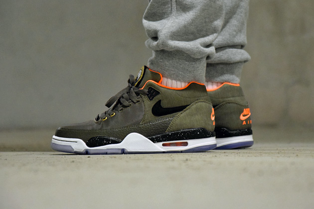 Nike a déjà sorti deux coloris sur son tout nouveau modèle intitulé Flight Squad. Un troisième vient de faire son apparition en sortie Quickstrike. L’inspiration est toujours militaire mais cette fois-ci les designers sont allés un peu plus loin en s’inspirant des Flight Jacket MA-1 (bombers). L’extérieur de la paire est en nylon et cuir brossé de couleur khaki. L’intérieur fait référence au blouson avec son coloris orange. Le patch peut être retiré pour laisser apparaitre l’inscription Flight Squad. Le même type de design avait d’ailleurs été appliqué par l’équipe d’Undefeated sur la fameuse Air Jordan IV.