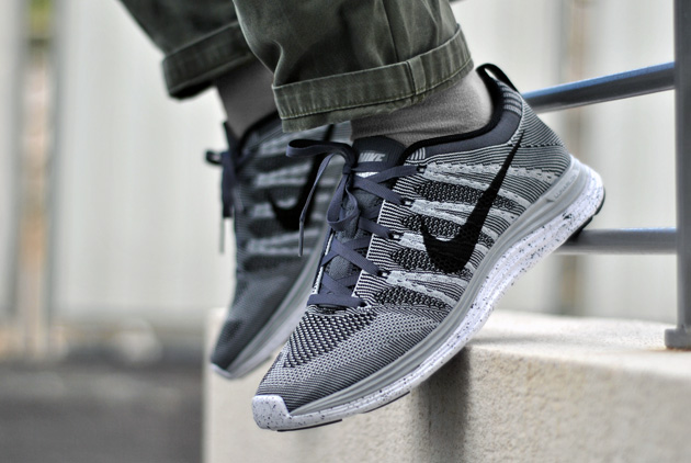 Nike continue de sortir de nouveaux coloris sur sa Nike Flyknit Lunar 1+. Cette fois-ci la version est plutôt sobre avec un mélange de gris et de noir. La semelle est légèrement tachetée.