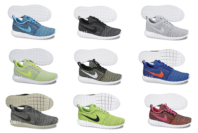Les Roshe Run et les Flyknit sont deux des plus gros succès commerciaux de Nike de ces deux dernières années. Il n’est pas donc pas une surprise de voir ces deux modèles associés pour la fin d’année. Le résultat est donc une Roshe Run utilisant la technologie Flyknit pour son empeigne. Deux types de semelles seront disponibles : une classique EVA et une NM (Natural Motion) pour plus de souplesse. Onze paires sont, pour l’instant, visibles mais aucune date de sortie n’a encore été dévoilée.