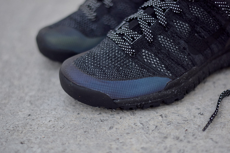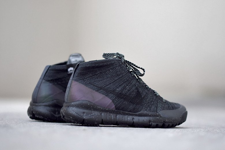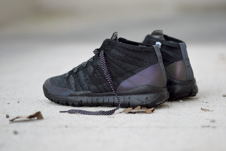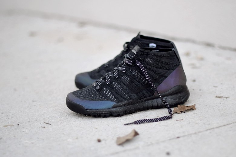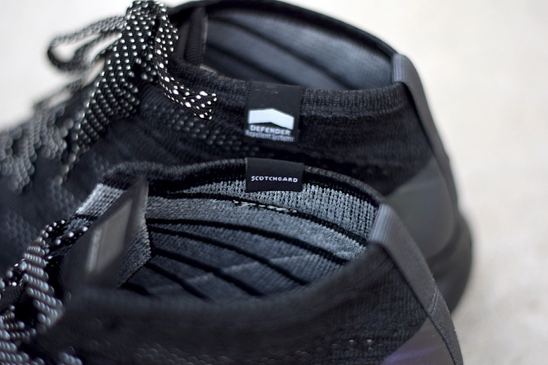 Elle est donc de retour pour l’hiver 2015/2016 dans une version typiquement de saison. La paire est toute noire avec un tissage Flyknit qui mélange du noir avec du gris de manière assez subtile. On retrouve d’ailleurs ce combo sur la semelle extérieure. Les petites touches d’originalité résident dans l’utilisation d’un Hyperfuse (les empiècements à l’avant et l’arrière) iridescent et les lacets bicolores à pois. Le chausson en Flyknit a été traité pour être imperméable (technologie Scotchguard), très pratique dans les semaines à venir.
