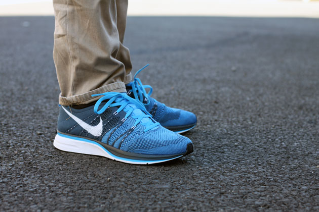 Après la version Pink/Navy présentée en début de semaine, la Nike Flyknit Trainer+1 revient dans un coloris mêlant deux sortes de bleu. C’est en effet un bleu clair qui a été associé à un bleu marine sur cette silhouette running bénéficiant de la technologie Nike Flyknit.