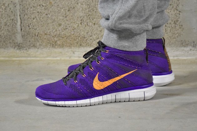 Les modèles de Free Flyknit Chukka sont généralement très colorés. Cette paire ne fait pas exception puisque l’on retrouve un upper flyknit « Hyper Grape » parsemé de quelques touches d’orange appelé ici « Atomic Mango ». La languette est, quant à elle, entièrement noire. Les lacets utilisent la technologie 3M et reflètent donc la lumière dans le noir. Ce modèle est en vente sur notre e-shop.