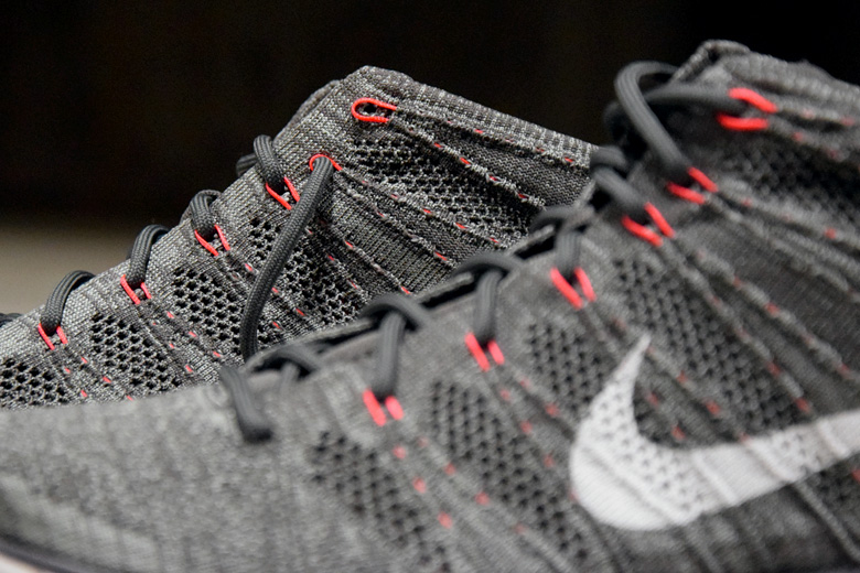 Le modèle est toujours identique : chausson en Nike Flyknit, les passants de lacets en Nike Flywire. Les designers avaient plutôt l’habitude dernièrement de sortir des version extrêmement colorées de la Nike Free Flyknit Chukka. Ici on a droit à un tissage sobre mélangeant plusieurs teintes de gris. Le Swoosh est blanc et va de pair avec la semelle extérieure. Une petite touche de couleurs avec ce Bright Crimson (un rouge brillant, sorte d’infrared) a été appliquée sur le Flywire et l’empiècement situé au talon. On la retrouve également sur le logo signature de la languette.