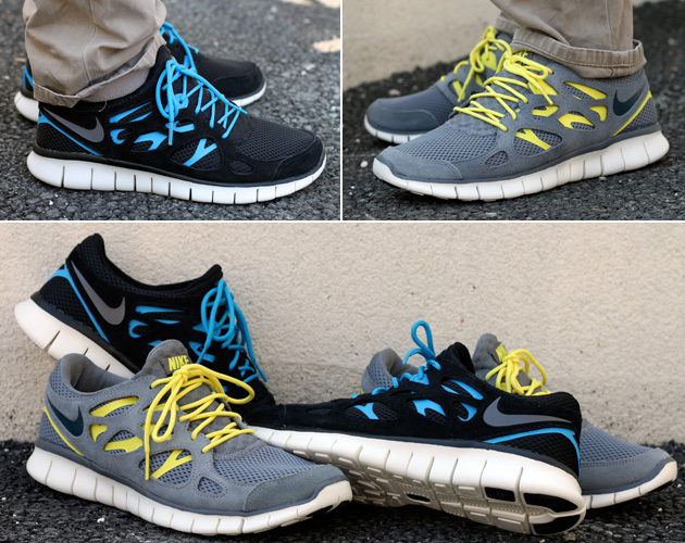 La très légère, et extrêmement confortable, Nike Free Run+2 revient cet été dans deux nouveaux coloris. La première version combine du noir avec du bleu. Le second modèle est, dans sa majeure partie, gris avec quelques pointes de jaune et la virgule bleu marine (située au niveau du talon).