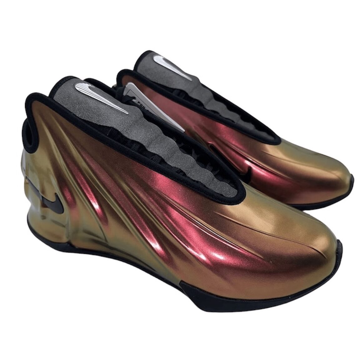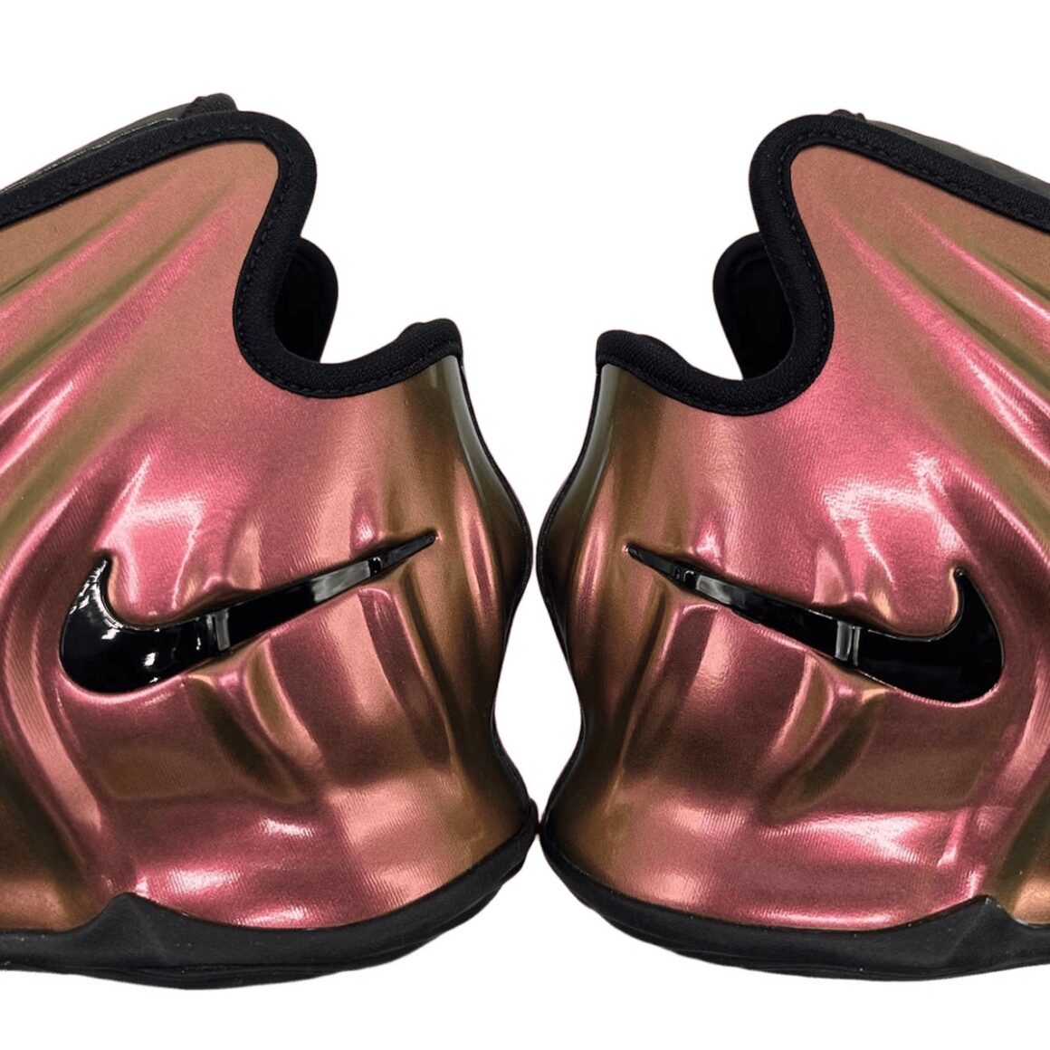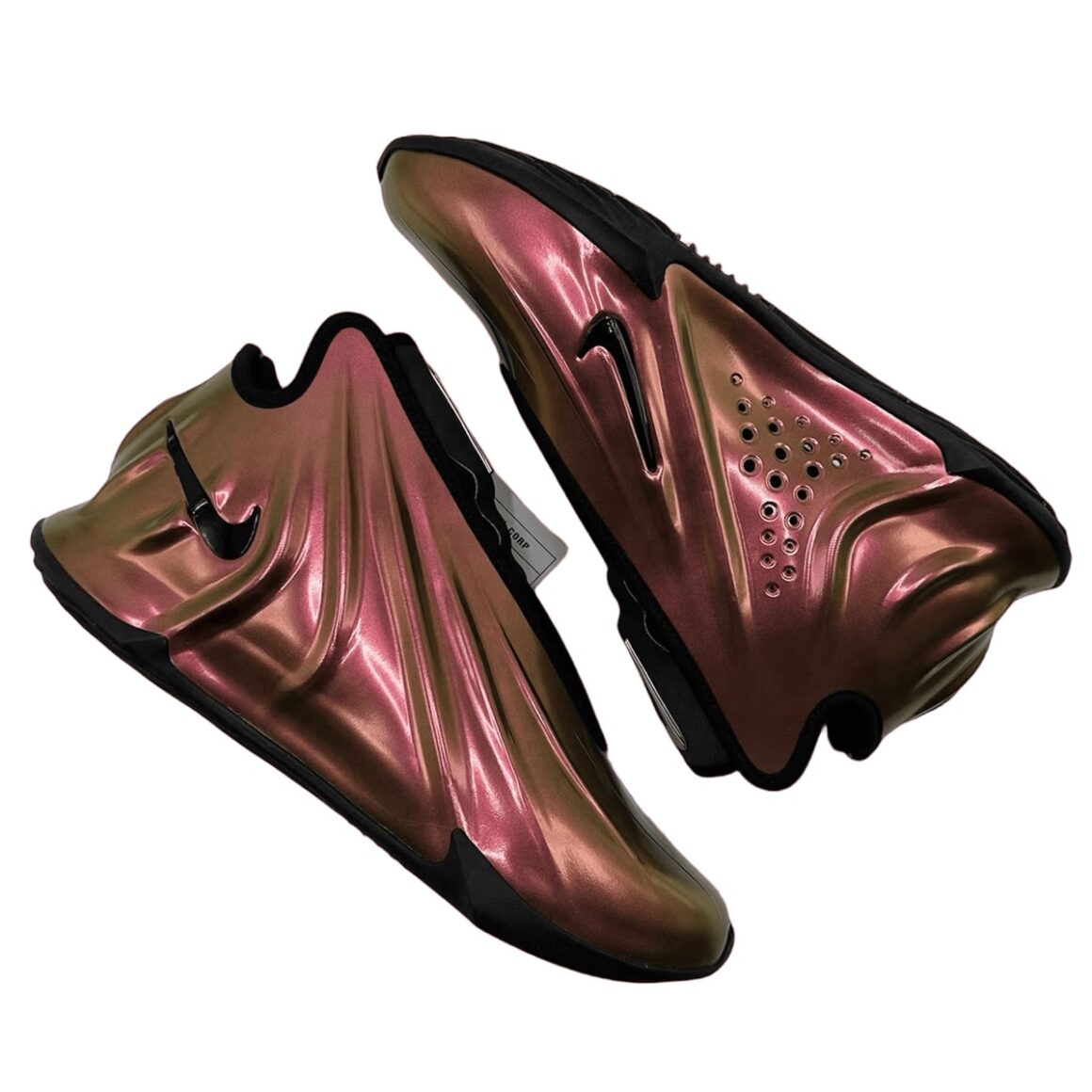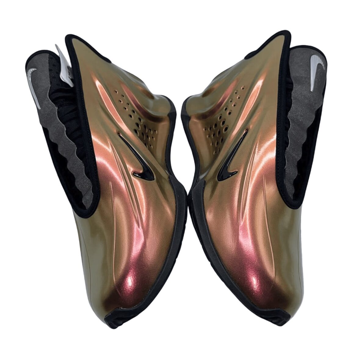 La Nike GT Future Copper a une aura particulière. Plutôt que d’opter pour des teintes standard ou des contrastes nets, Nike a choisi une couleur métallique cuivrée, riche et chaleureuse, qui couvre l’essentiel de la tige. Cette teinte évoque à la fois la lumière du soleil hivernal, la lueur des métaux polis et une élégance subtile. Le cuivre, légèrement matifié, semble presque vivant, capable de capturer la lumière et de jouer avec les reflets selon les angles. Le quart arrière de la tige arbore un Swoosh noir, assorti aux liserés qui définissent le sockliner et les passages de lacets. La languette en néoprène se pare de gris et affiche un Swoosh métallique. Une semelle extérieure noire finalise ce design.