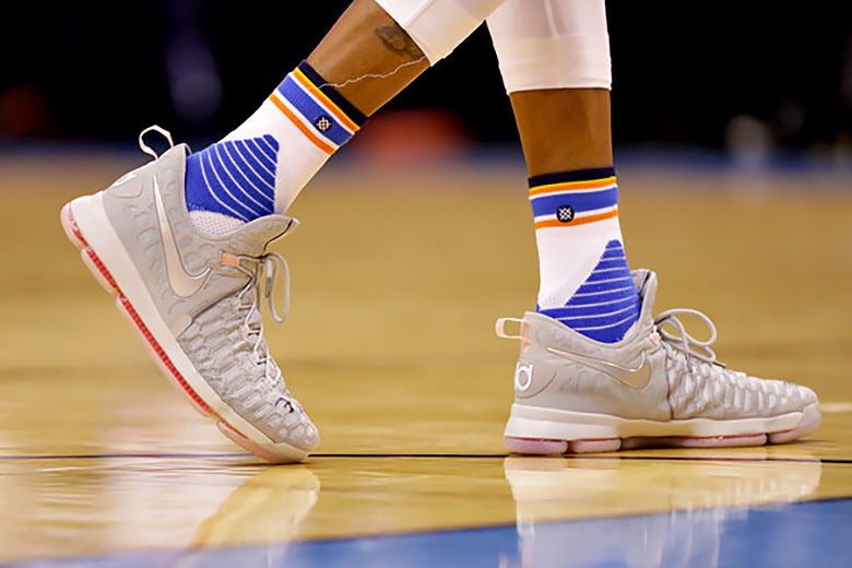 Annoncée il y a deux mois par Nike Basketball, la Nike KD 9 fait enfin son apparition sur les parquets NBA aux pieds de l’excellent Kevin Durant. Ce dernier, complété par un très performant Russell Westbrook, progresse dans ces Playoffs 2016 et pourrait bien arriver en finale avec le Thunder d’Oklahoma City.