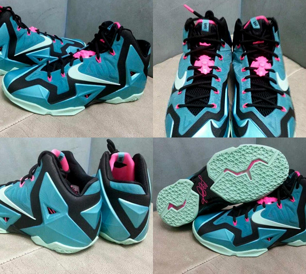 Le coloris ‘South Beach’ tant attendu par les aficionados de la série Lebron chez Nike arrivera à point nommé pour l’été, c’est à dire le 21 juin 2014. Cette Nike Lebron 11 bleu, noir et rose disposera d’une semelle et d’un swoosh qui pourraient être Glow in the dark.