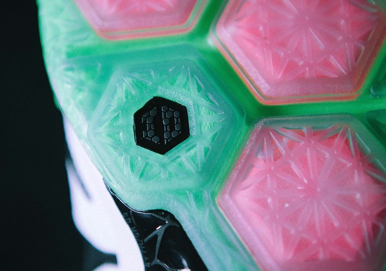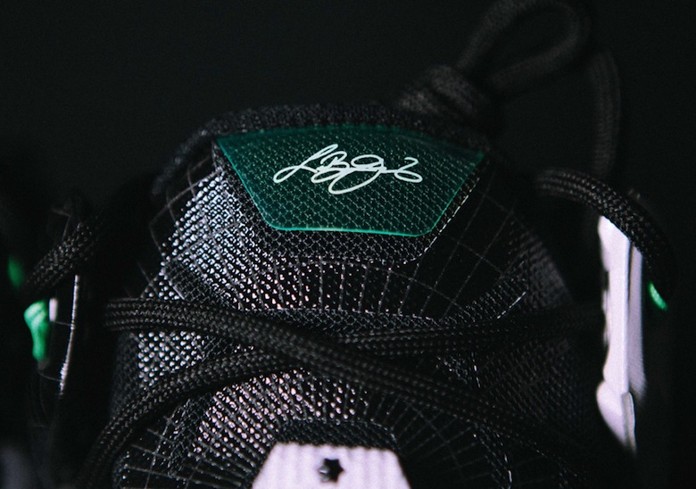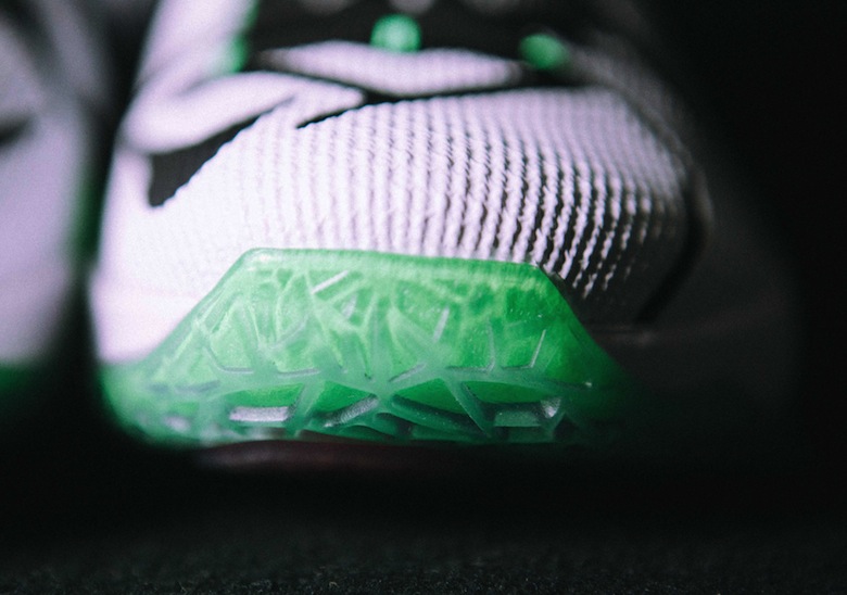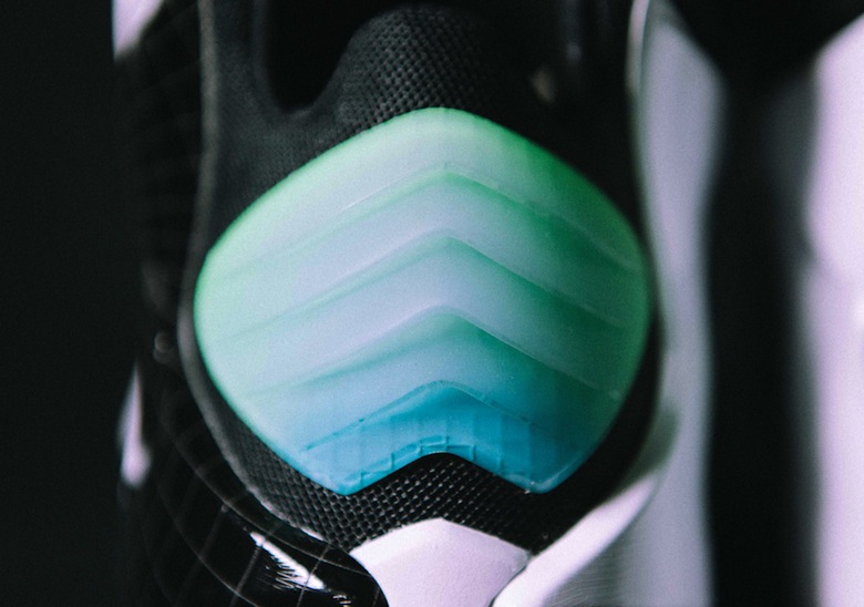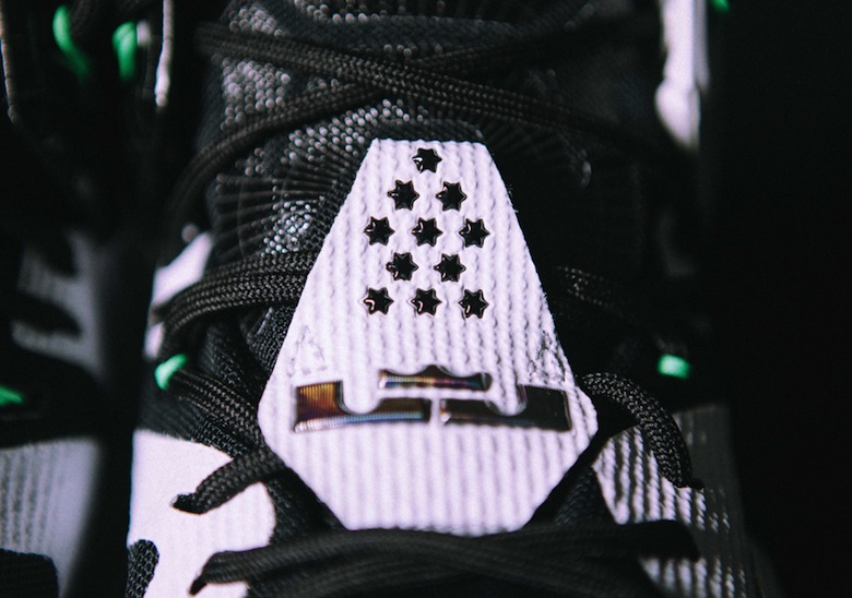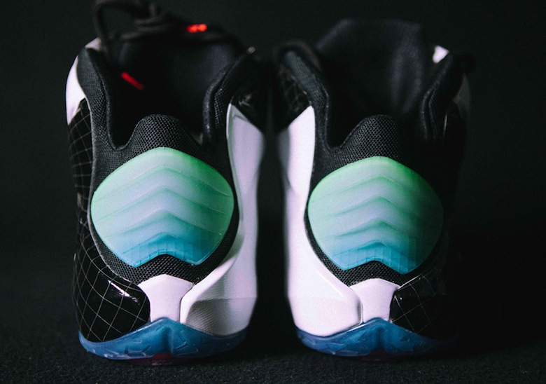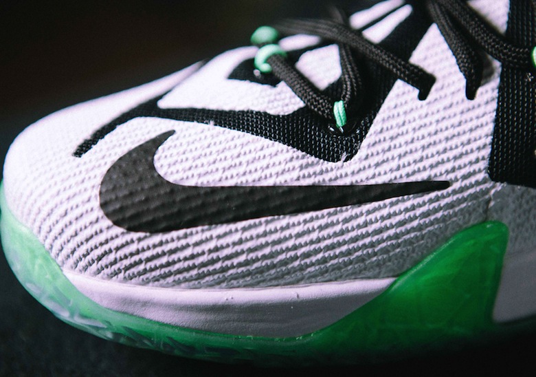 Cette année, la paire allouée à Lebron James arbore une empeigne sobre avec ce mélange de blanc et de noir. Les designers de la marque américaine ont également souhaité apporter une petite touche fun à ces sneakers en optant pour un swoosh irisé et une semelle extérieure translucide aux accents de vert.
