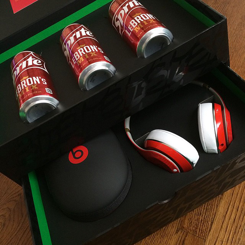 Cette paire au coloris rouge et vert fait partie d’un pack composé également d’un casque Beats et de trois canettes de Sprite Lebron’s Mix.