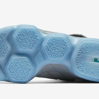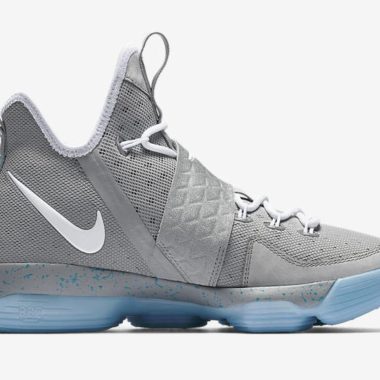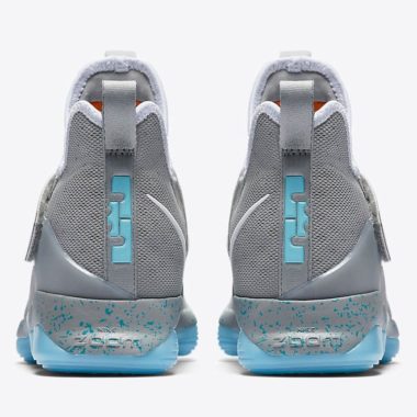 Cette association de couleurs a déjà été adaptée sur d’autres modèles du catalogue Nike et nous le retrouvons avec plaisir sur une Nike Lebron 14 prévue pour ce 6 avril sur le site de Nike. La sneaker arbore donc ce mélange de gris, de blanc et de bleu clair si significatif de la Nike Air Mag. La teinte colle plutôt bien au modèle avec sa tige haute et sa grosse semelle. On retrouve à l’intérieur de la paire les couleurs s’illuminant avec les inscriptions « LJ » et « 23 » respectivement sur le pied gauche et le pied droit.