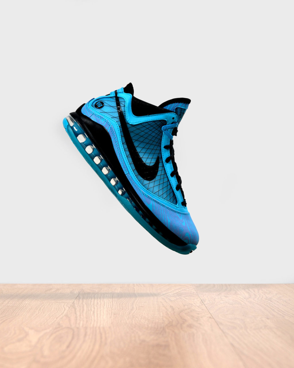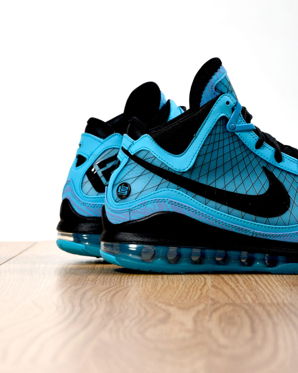 Il y a dix ans, lors du même évènement à Dallas, Lebron James portait ce même modèle qui revient aujourd’hui. L’empeigne de cette Lebron 7 est habillée d’un bleu surnommé « Chlorine » et à la base destiné à s’accorder aux tenues portées par la conférence est en 2010, puisque Lebron James évoluait aux Heat de Miami. Ironie du sort, ce chlorine s’accorde aussi parfaitement au thème retenu pour les couleurs des sneakers des joueurs qui doivent représenter le drapeau de Chicago, lui-même bleu ciel et rouge. Les panneaux Flywire, les swoosh, les lacets et autres détails tels que la signature du joueur sur la languette sont tous parés de noir. L’imposante unité d’air soutient une semelle intermédiaire aussi noire et est portée par une semelle extérieure bleue.