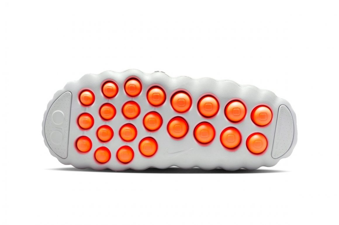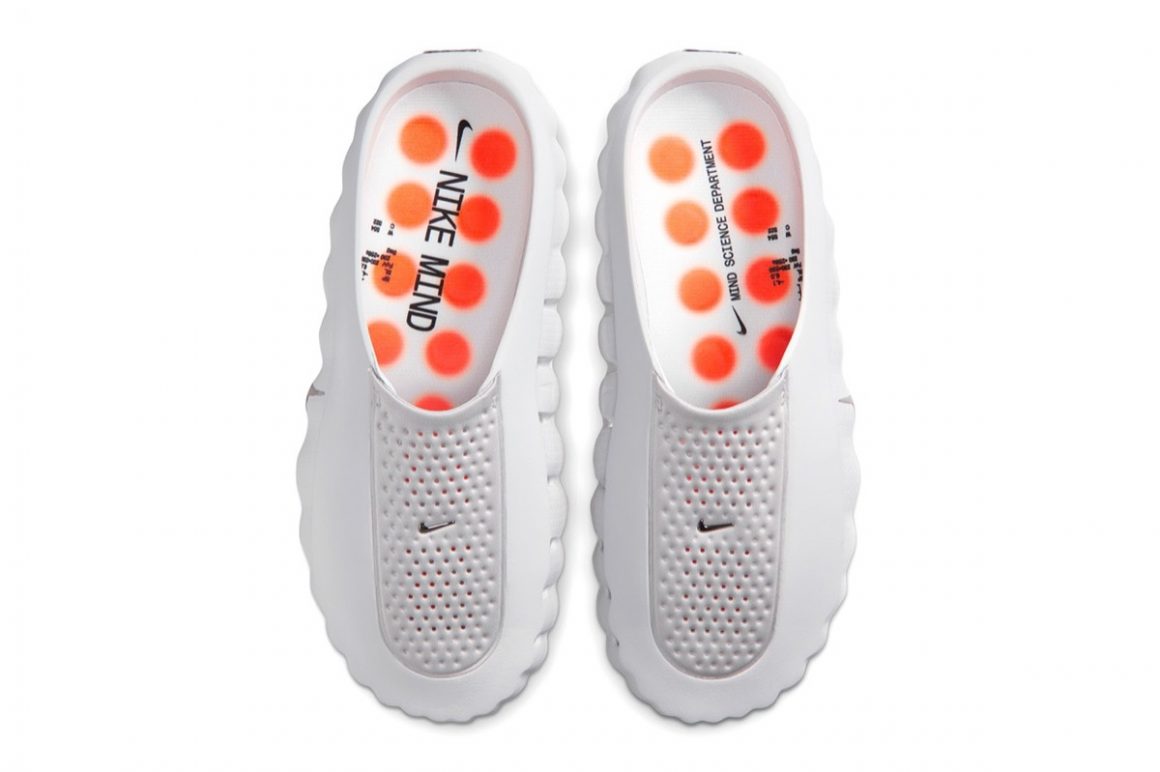 La Nike Mind 001 se distingue dès le premier regard par son design épuré et sa silhouette monobloc fluide. La tige est formée d’un matériau perforé léger, offrant respirabilité et confort. Elle se prolonge presque naturellement vers la semelle, sans rupture visuelle marquée, créant une continuité sculpturale presque organique. Le premier coloris, Light Smoke Grey, enveloppe l’ensemble, donnant une teinte neutre qui met en valeur les formes. Un petit Swoosh argenté est placé verticalement sur le panneau latéral extérieur, tandis qu’un second, plus petit, est placé sur la toebox perforée. L’effet général évoque une slide design, à mi-chemin entre concept shoe et objet d’intérieur de luxe. Pour aider à la récupération, la semelle est dotée de mini pods orange fluo, de forme sphérique pour un amorti efficace.