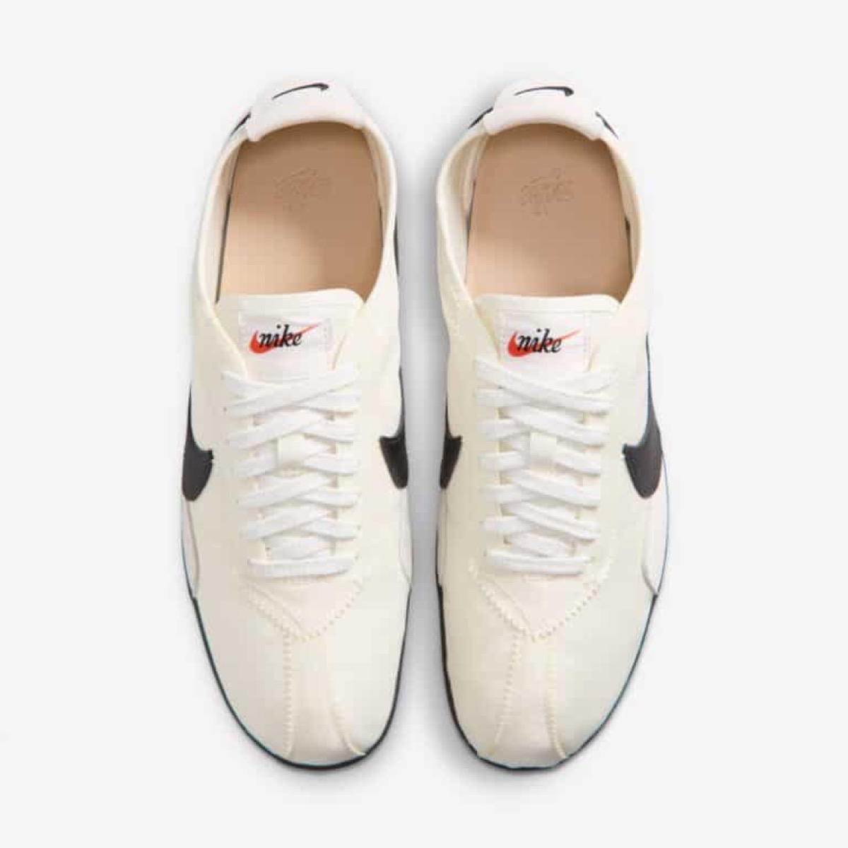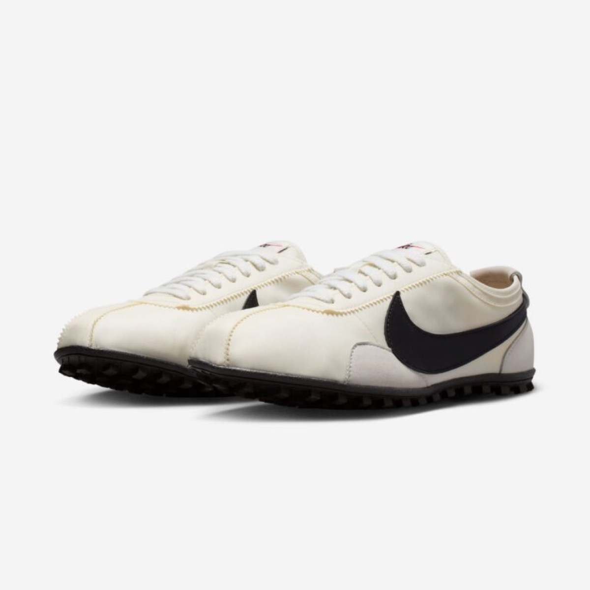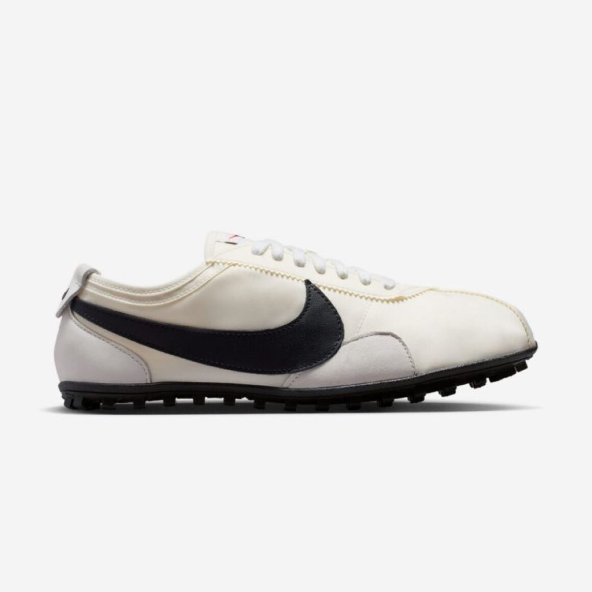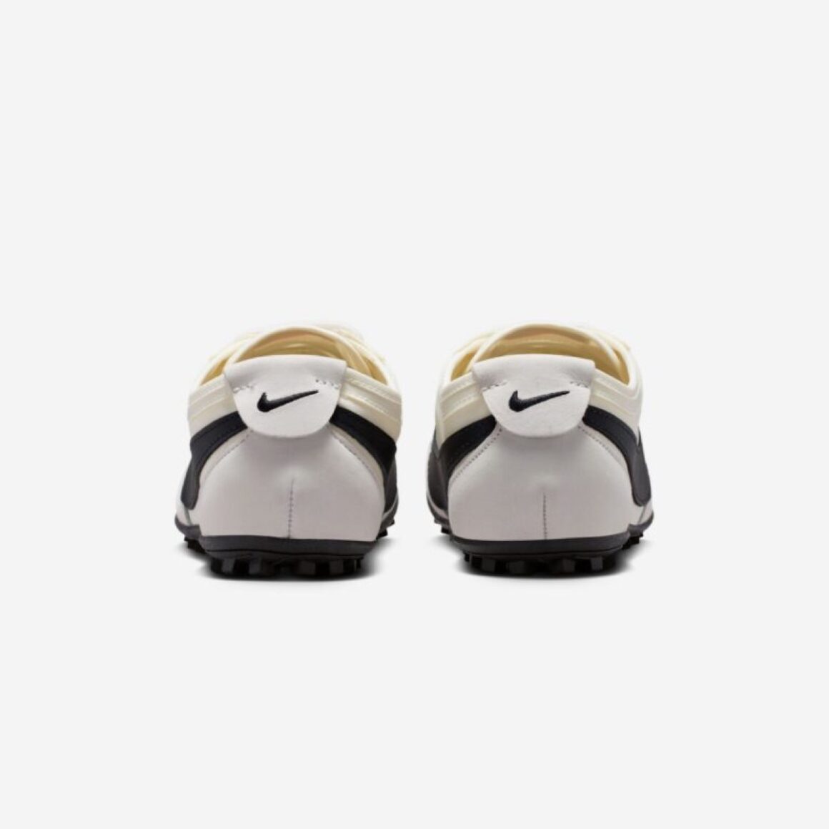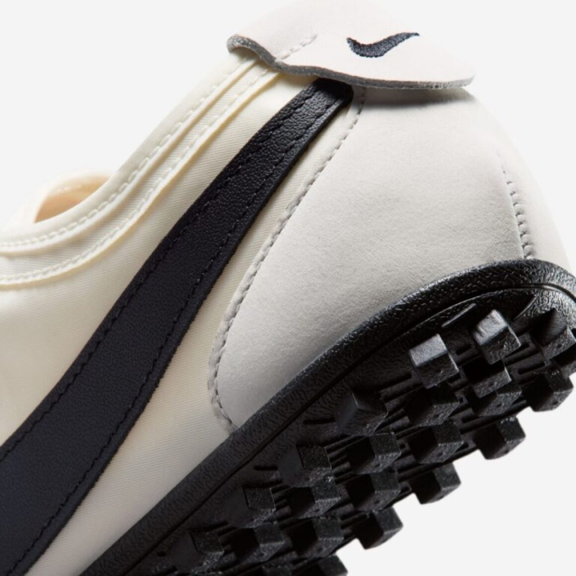 La Nike Moon Shoe Soft Pearl se caractérise par une palette très douce, composée de blanc cassé et de nuances crème. La tige utilise une teinte légèrement nacrée qui donne son nom à la paire, tandis que les renforts restent dans des tons similaires pour garder un rendu monochrome. Cette sobriété permet de mettre en valeur la forme particulière de la Moon Shoe, sans ajouter de contrastes trop marqués. La semelle intermédiaire est fine et noire, posée sur une semelle extérieure assortie, et ornée du motif gaufré emblématique. Ce détail rappelle directement les premières versions testées par Nike, dont la semelle laissait une empreinte rappelant la surface de la lune, d’où le nom Moon Shoe. L’imposant Swoosh latéral s’habille de cuir noir, et rappelle le mini Swoosh brodé au talon, ainsi que le branding au sommet de la languette. Ce coloris Soft Pearl est clairement pensé pour un usage lifestyle, avec une esthétique très propre et facile à porter.
