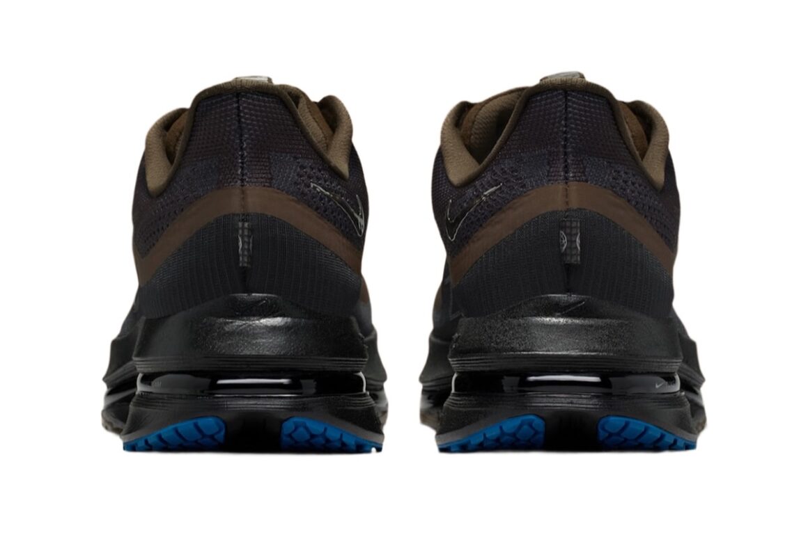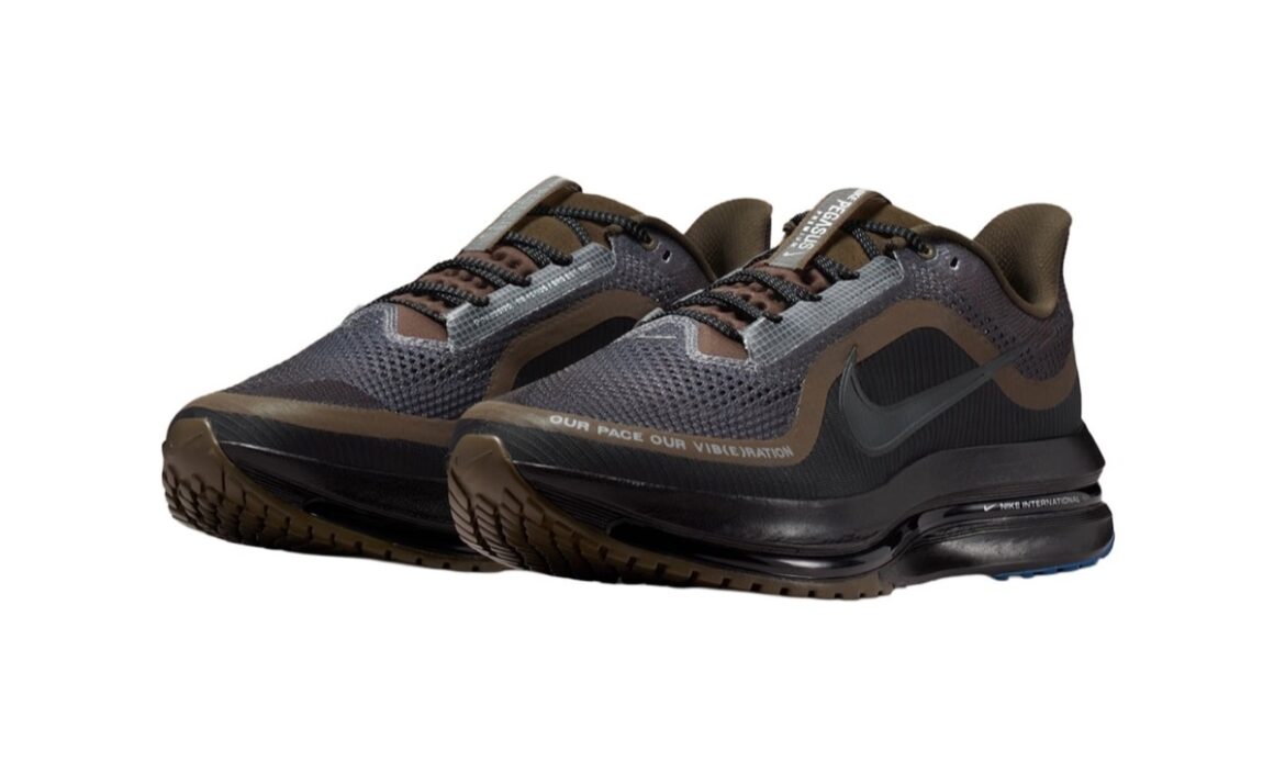 Le point de départ de ce pack est la Nike Pegasus Premium Dark Hazel, une version enrichie de la Pegasus classique, silhouette de référence pour les coureurs quotidiens. Connue pour son équilibre entre confort, réactivité et polyvalence, la Pegasus Premium ici porte une teinte Dark Hazel, un brun chaud, terreux, presque organique, qui donne à la paire une présence visuelle subtile mais affirmée, idéale pour ceux qui souhaitent une sneaker à la fois performante et intégrable à un vestiaire lifestyle. Sur cette édition, la tige reprend les lignes de la Pegasus : un mesh respirant et flexible qui épouse le pied, des renforts texturés pour assurer maintien et structure, le tout souligné par une palette sombre entre le brun et le noir, qui évoque la terre et l’énergie d’un sentier de course en forêt. La toebox porte le slogan du pack “Our Pace, Our Vib(e)ration”, comme pour signer l’individualité de chaque coureur. La semelle intermédiaire combine amorti moelleux et retour d’énergie suffisant pour rendre chaque foulée fluide.