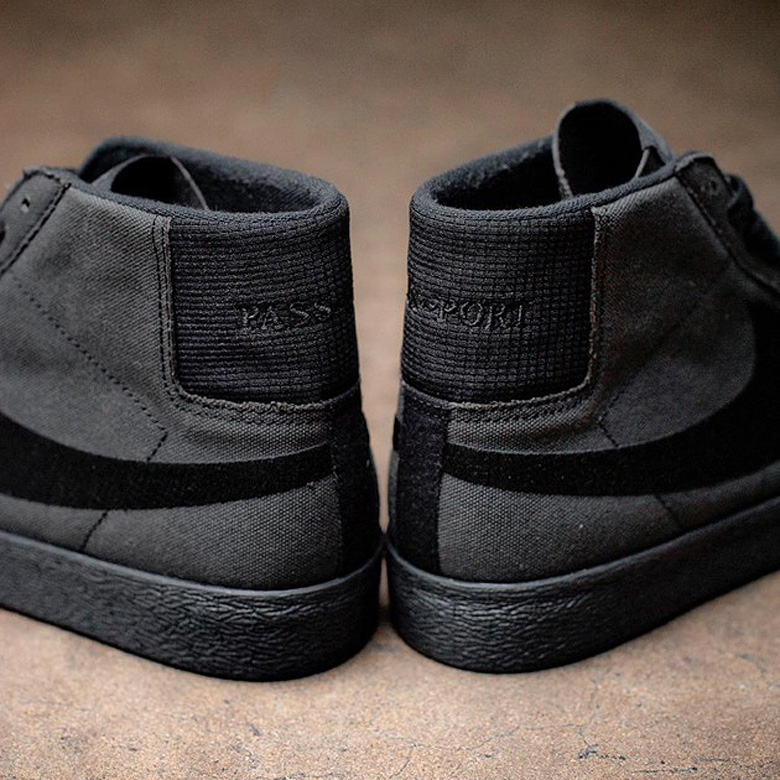 Ici le modèle est tout noir et le Swoosh ainsi que le nom Pass Port sont brodés sur les côtés et le talon de chaque pied. Cette paire en toile dispose d’une semelle extérieure en gomme.