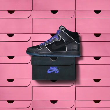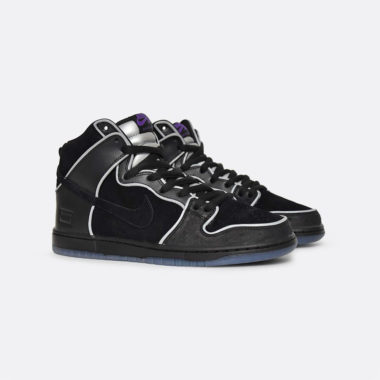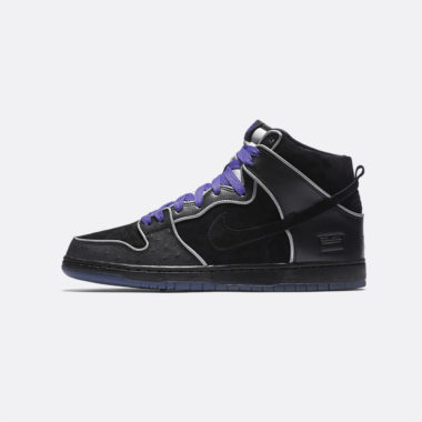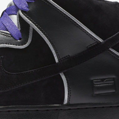 Après la paire orange et beige correspondant au début de la gamme et les paires aux coloris gris puis rose on découvre la paire de Nike Dunk Black Box qui clôturera ce pack. Il s’agira d’une Nike SB Dunk Hi qui reprend, point par point, les caractéristiques de la paire sortie en 2007 pour le rappeur Américain MF Doom. En effet, on aura droit à un mélange de matériaux premium comme du suede, du cuir lisse et un simili cuir d’autruche pour l’avant du pied. Chaque empiècement sera entouré par un liseré réfléchissant. Pour faire un rappel à la couleur des logos présents sur la boîte, les lacets rouges seront remplacés par des violets.