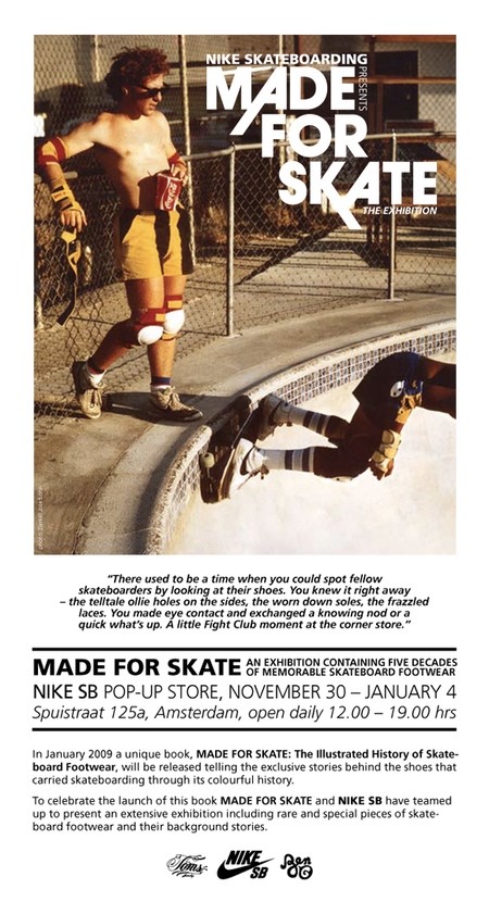 Une exposition sur le skate (et en particulier pour la sortie de l’ouvrage MADE FOR SKATE) a démarré le 30 novembre à Amsterdam et s’achèvera le 4 janvier. Pour l’occasion une paire de blazer rendant hommage à l’une des toutes premières sneakers de skate a été éditée (24 exemplaires vendus la semaine dernière). Un pop up store Nike a également été mis en place et chaque semaine des anciens modèles de la gamme SB seront mis en vente au retail price (on a déjà pu voir entre autres : Unlucky, Shanghai 1, Hawaii…).