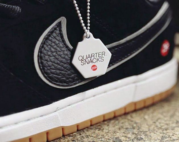 QuarterSnacks est un web-magazine établi depuis 2005 qui traite de l’actualité du skate à New-York et ses environs. Nike SB a fait appel à cette entité pour réaliser une paire de Dunk Low très sobre. Le nom du site figure à l’arrière des pieds et le logo, 25¢, est présent sur le côté et apposé au logo Nike sur la languette. Cette édition limitée est prévue pour ce mois-ci.