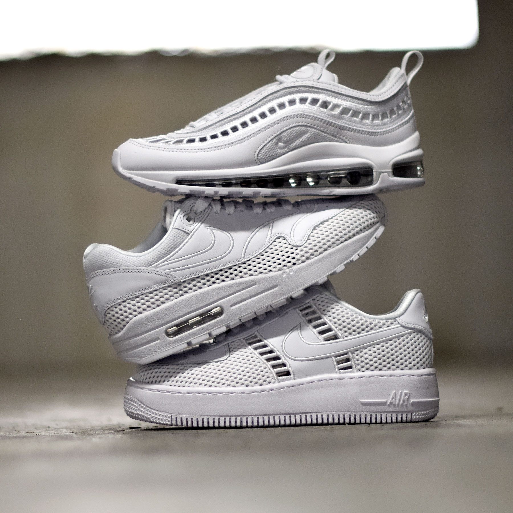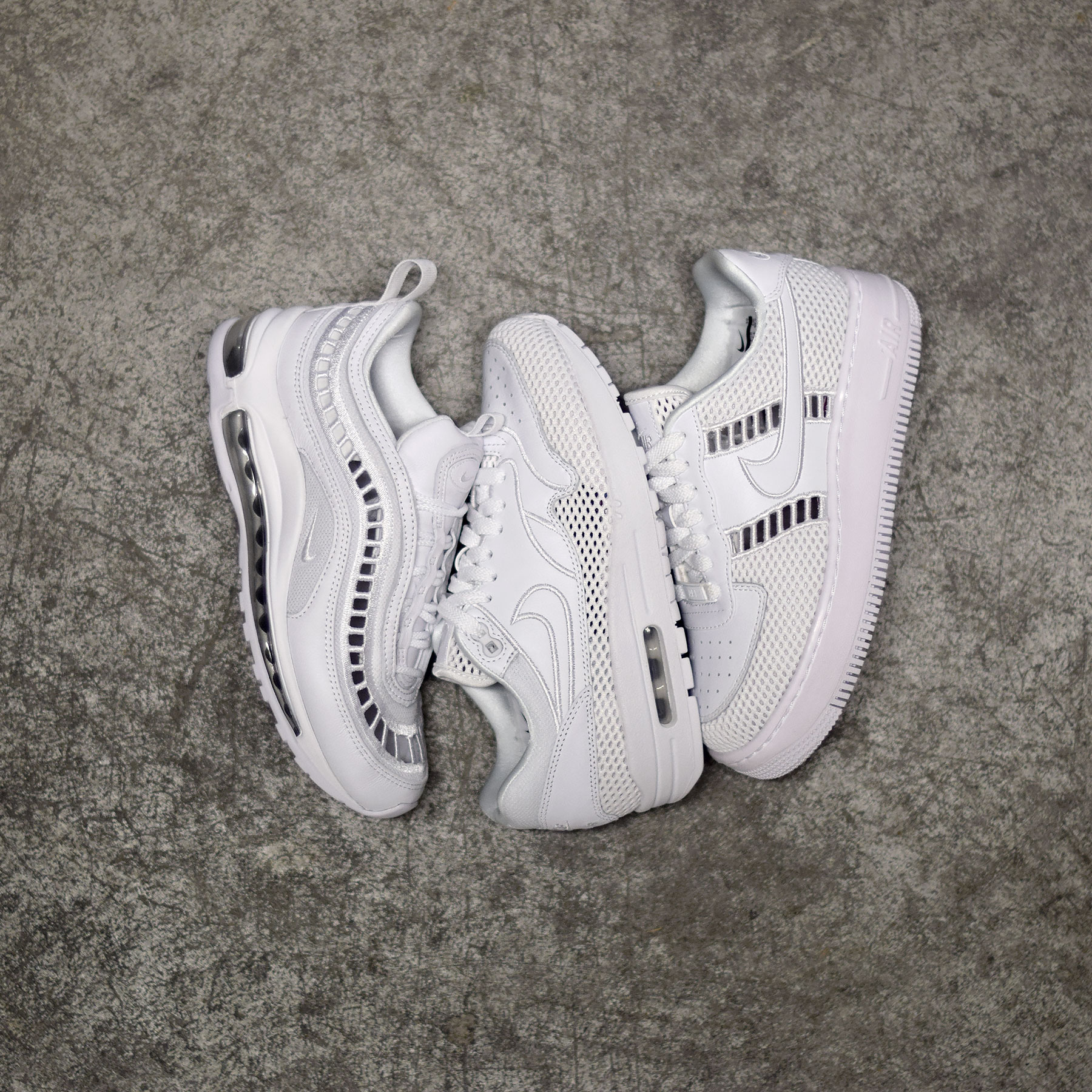 Comme vous le savez, Nike à la volonté de proposer de nouvelles déclinaisons de ses modèles les plus iconiques. Pour cette édition, ces trois paires sont présentées dans un schéma très minimaliste. Chacune d’entre elles bénéficie d’une empeigne en mesh associée à des empiècements en cuir lisse. La principale source d’originalité réside dans la structure de l’empeigne qui confère à ce pack un aspect déstructuré. L’ensemble de ces silhouettes sont proposées dans un coloris monochrome blanc, idéal pour les beaux jours à venir. Une nouvelle fois, le rendu final est de très bonne qualité et ravira à coup sûr le public féminin de l’enseigne.