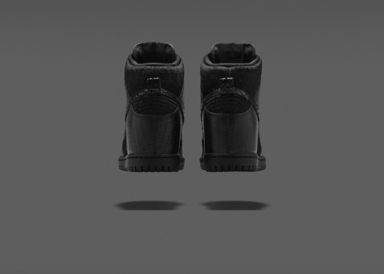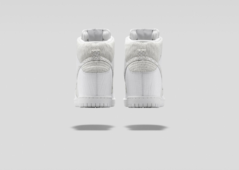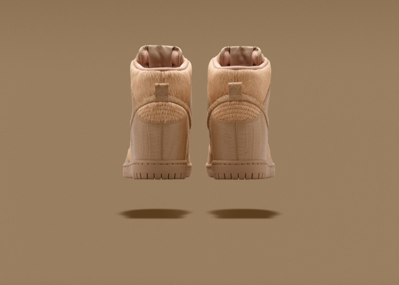 Trois coloris ont été réalisés avec la même base de matériaux. On a le droit en effet à des cuirs premium associés à de fausses matières animales. Le designer Japonais aurait sélectionné la Nike Dunk Sky Hi car c’est un modèle plutôt populaire dans son cercle d’amis. Les sneakers sont monochromes (beige, blanc ou noir) avec de faux poils de poney, cuir de crocodile et enfin peau de serpent. Le tout est assez habilement juxtaposé pour un rendu qui n’est pas surchargé. La semelle intérieure est sobrement signée du nom du label.