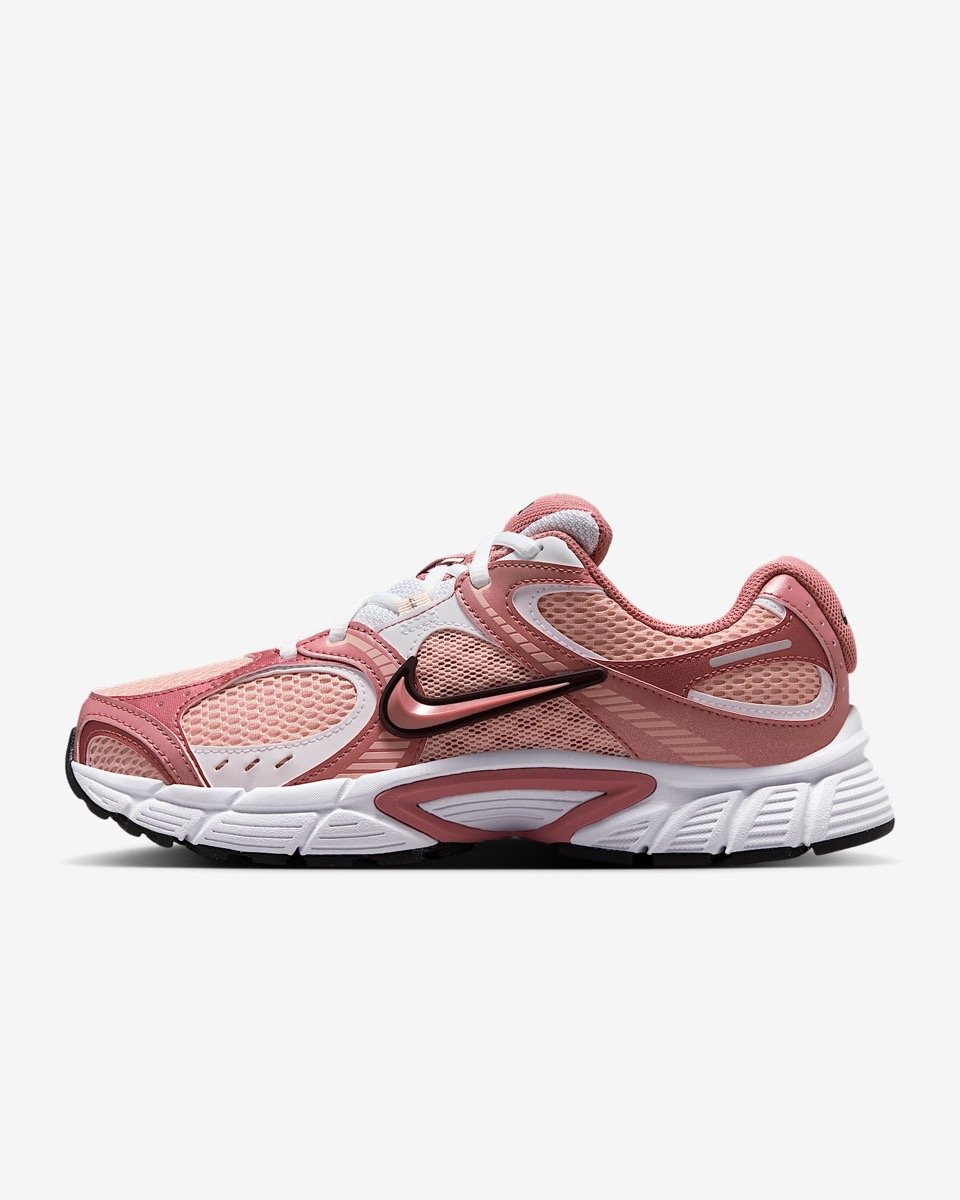 La Nike V5 RNR puise directement dans l’ADN des modèles performance du début des années 2000. Elle reprend les lignes essentielles de cette époque, comme une tige en mesh technique respirant, des superpositions dynamiques en cuir synthétique, des découpes agressives et une allure profilée, prête à avaler les kilomètres. Le mesh léger, visible sur la toebox et les panneaux latéraux, laisse entrevoir les volumes internes, tandis que les empiècements de renfort en cuir apportent la touche indispensable à toute bonne paire d’inspiration Y2K. Un Swoosh en relief, presque sculpté, ajoute un élément visuel fort sur le flanc de la sneaker. Positionné de façon légèrement surélevée, il crée un contraste à la fois visuel et textural. Le talon est renforcé, la languette rembourrée et le sockliner doublé. Chaque élément de design semble pensé pour maximiser à la fois la fonctionnalité et l’esthétique.