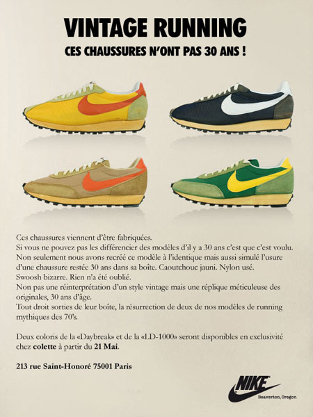Tout est sur la petite image mais ne vous inquiétez pas si vous n’avez pas le temps de les avoir chez Colette en avant-première elles devront sortir dans plusieurs shops quelques jours ou semaines plus tard. Nous vous avions déjà parlé de ce programme running grâce auquel Nike souhaite reproduire les modèles d’antan tout en prenant compte du vieillissement. La qualité des paires est superbe et le résultat l’est tout autant. A suivre sur notre forum !