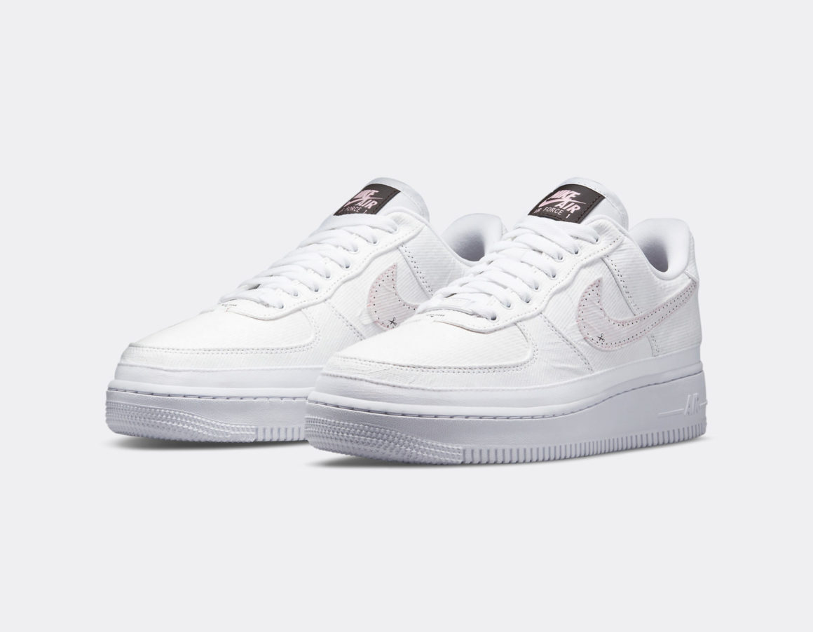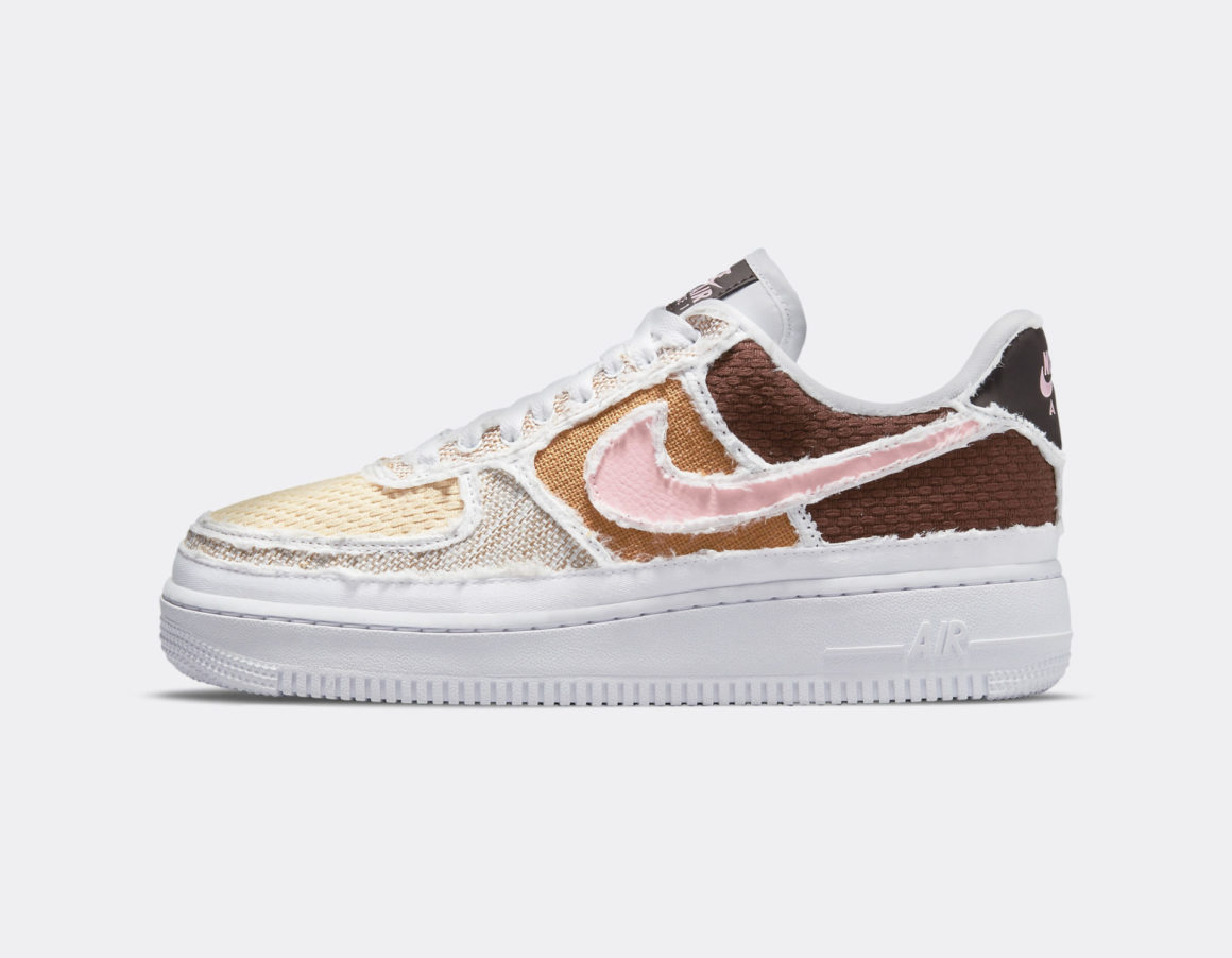 Sur cette version Tear Away, la silhouette de la Nike Air Force 1 immaculée est recouverte d’un tissu léger, nous invitant à découvrir ce qui se cache en dessous. Un premier coloris, baptisé Fauna Brown, cache une toebox et un panneau arrière en mesh épais et texturé. Respectivement couleur crème et marron, ils donnent le ton de cette création sous-jacente. Le garde-boue avant est en canvas sable chiné et s’accorde en matière au panneau latéral couleur camel. Le Swoosh arbore un cuir grainé rose pâle. On retrouve ce rose sur les logos Nike Air du heeltab et de la languette.