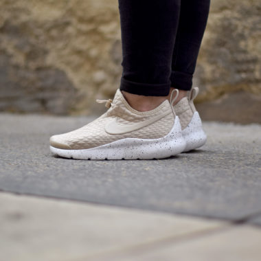 Son design assez minimaliste et épuré, proche d’une Nike Roshe Run, est différent par sa conception sans lacets. La spécificité du modèle réside dans son système de laçage qui est constitué d’un cordon ajustable avec un bouton stoppeur pour un réglage personnalisé. La version présentée ici possède une empeigne en relief donnant un joli aspect gaufré au modèle. Comme pour la plupart des nouveautés Nike de la saison Printemps 2017, la semelle intérieure est plus confortable avec de la mousse s’adaptant à la forme du pied. Sa semelle blanche mouchetée apporte une belle finition à ses sneakers.