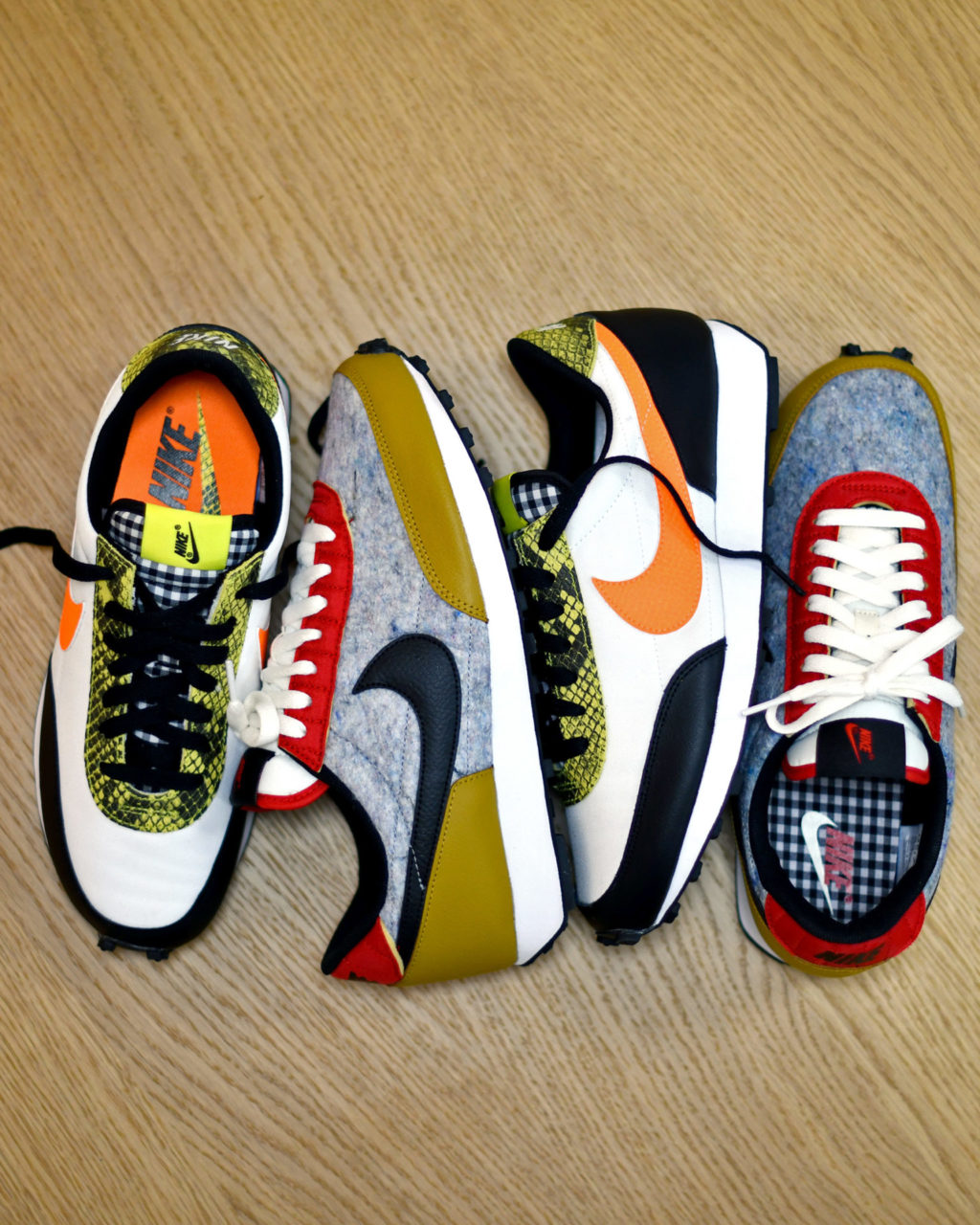 Le premier modèle, Black Total Orange, possède une empeigne en nylon blanc et deux pièces de cuir noir viennent renforcer l’avant et l’arrière de la sneaker. L’imposant Swoosh latéral est ici orange en cuir grainé et s’accorde à la semelle intérieure. Loin de ses premières ambitions athlétiques, la Daybreak revisitée arbore des empiècements en cuir python jaune et noir sur le talon et sur le passage des lacets, ce qui lui confère un style tout à fait adapté aux pavés des villes. Enfin, la languette est couverte d’un imprimé Vichy noir et blanc surmonté d’une étiquette jaune fluo ornée du logo Nike.