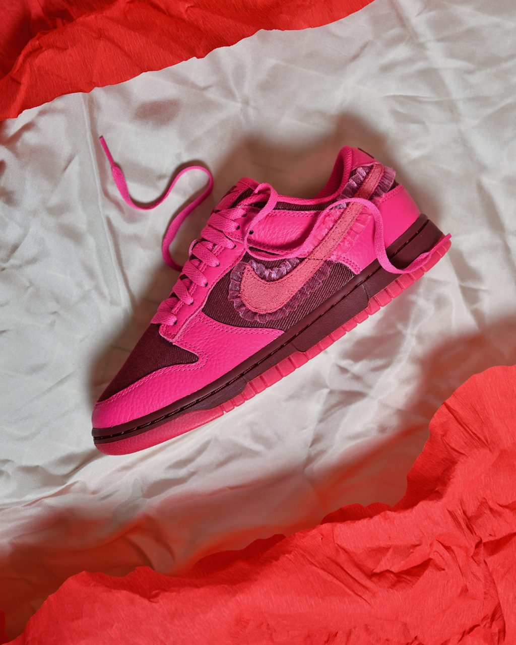 Comme à son habitude, Nike célèbre les fêtes tout au long de l’année, avec des modèles spéciaux. On se rappellera de la Nike Air Force 1 Easter ou encore de la Air Max 95 Halloween. À l’approche de la Saint-Valentin, la firme de Beaverton poursuit cette tradition en proposant un modèle dédié inédit. Cette année, la fête des amoureux est incarnée par une Nike Dunk Low exclusivement féminine. Après la Nike Air Force 1 ou la Air Max 97 Valentine’s Day, nous vous présentons ici la Nike Dunk Low éponyme.