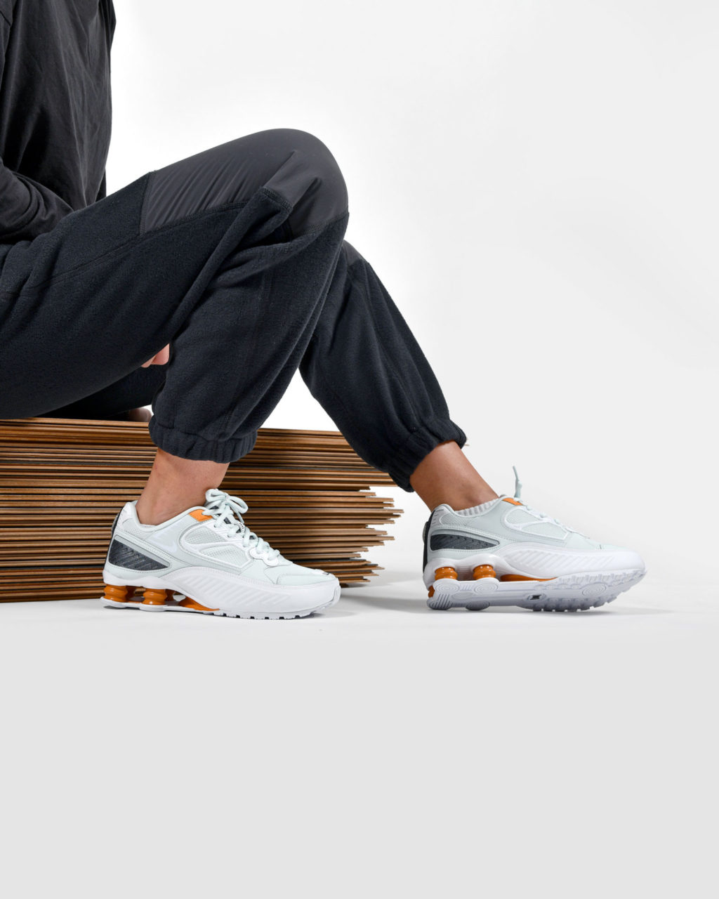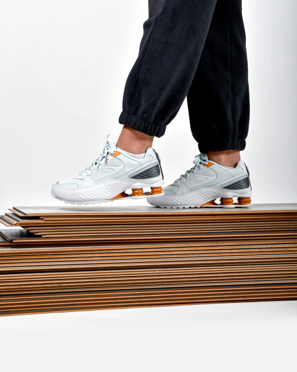 L’identité Nike Shox est très présente sur cette nouvelle mouture au design fuselé et aux traits racés. La paire reprend à ce titre de nombreux éléments ayant forgé sa réputation et notamment les incontournables piliers au talon pour un meilleur amorti. Le logo Shox est dupliqué sur les lacets et sur le haut de la languette. Autre trait spécifique, la multiplicité de détails en 3M comme sur les paires de l’époque. Le code couleur combine une empeigne à dominance blanc et bleu très pâle « Ghost Aqua », avec des éléments dorés ainsi que certains passants de lacets. Les designers ont souhaité apporter par ce biais un contraste intéressant. La sneaker adopte une construction en mesh et cuir tandis qu’une pièce technique en fibre de carbone vient renforcer la partie centrale de la semelle.