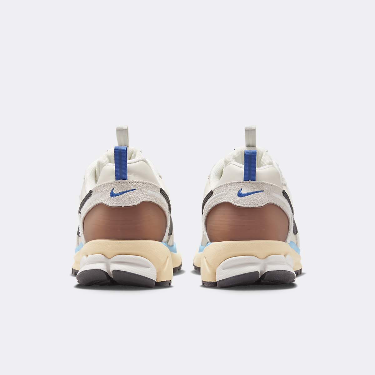 La Nike Zoom Vomero 5 « Design By Japan” reprend la silhouette racée de la running de 2011 et s’habille d’une base en cuir crème. Elle est renforcé d’empiècements en cuir suédé blanc cassé sur la toebox et les passages de lacets. Les panneaux latéraux en TPU crème sont ornés d’imposants Swoosh en cuir lisse noir au rendu inédit. La languette porte à son sommet une étiquette Nike, sur laquelle le nom du modèle s’inscrit en turquoise sur fond bleu. Ce bleu se retrouve sur certains passages de lacets, ainsi que sur la tirette au talon. Ce dernier est renforcé par du TPU couleur argile. La semelle intérieure est imprimée d’une photographie de Bill Bowerman concevant ses premières semelles pour Nike. La paire repose sur une semelle Zoom alternant entre blanc et crème, et liserée de turquoise.