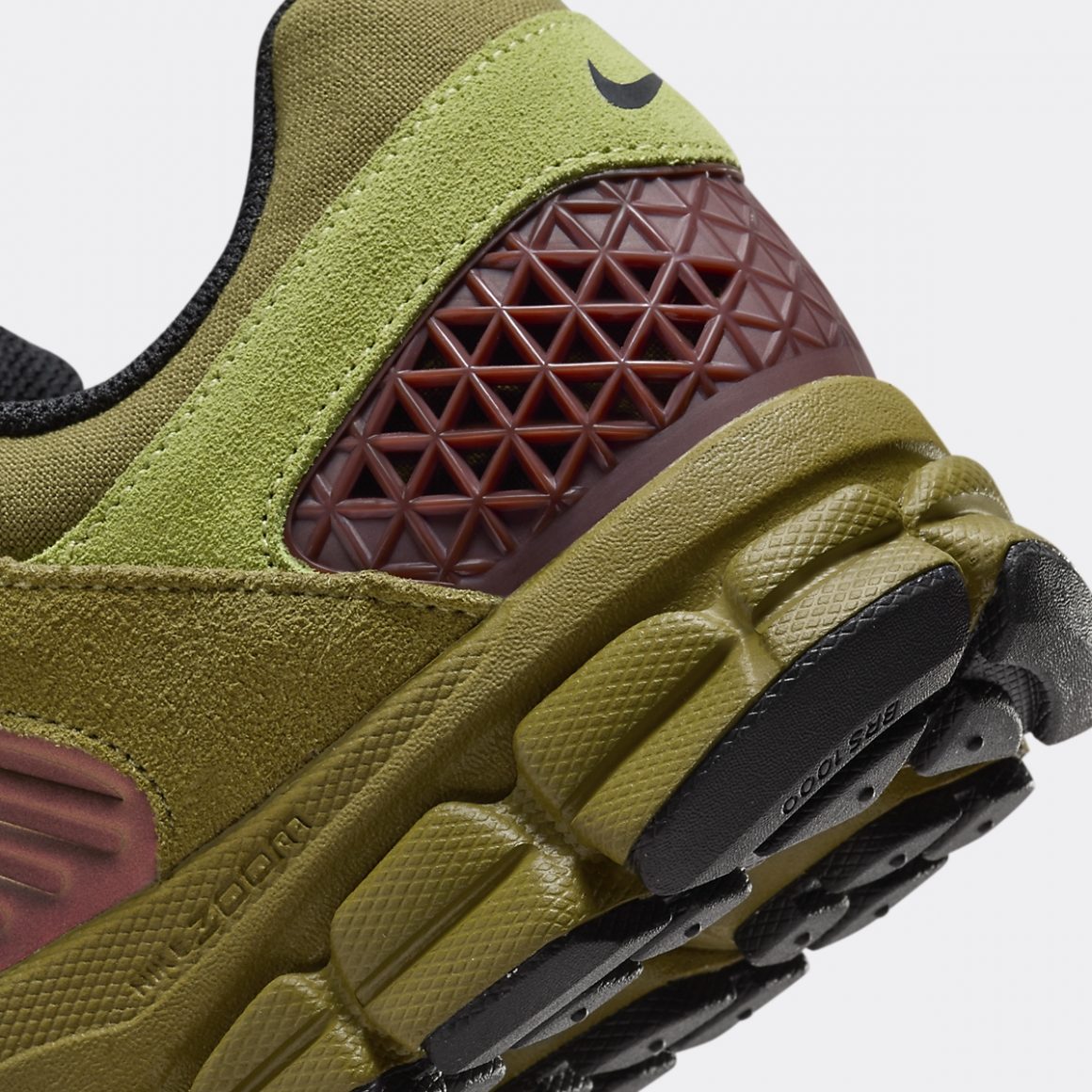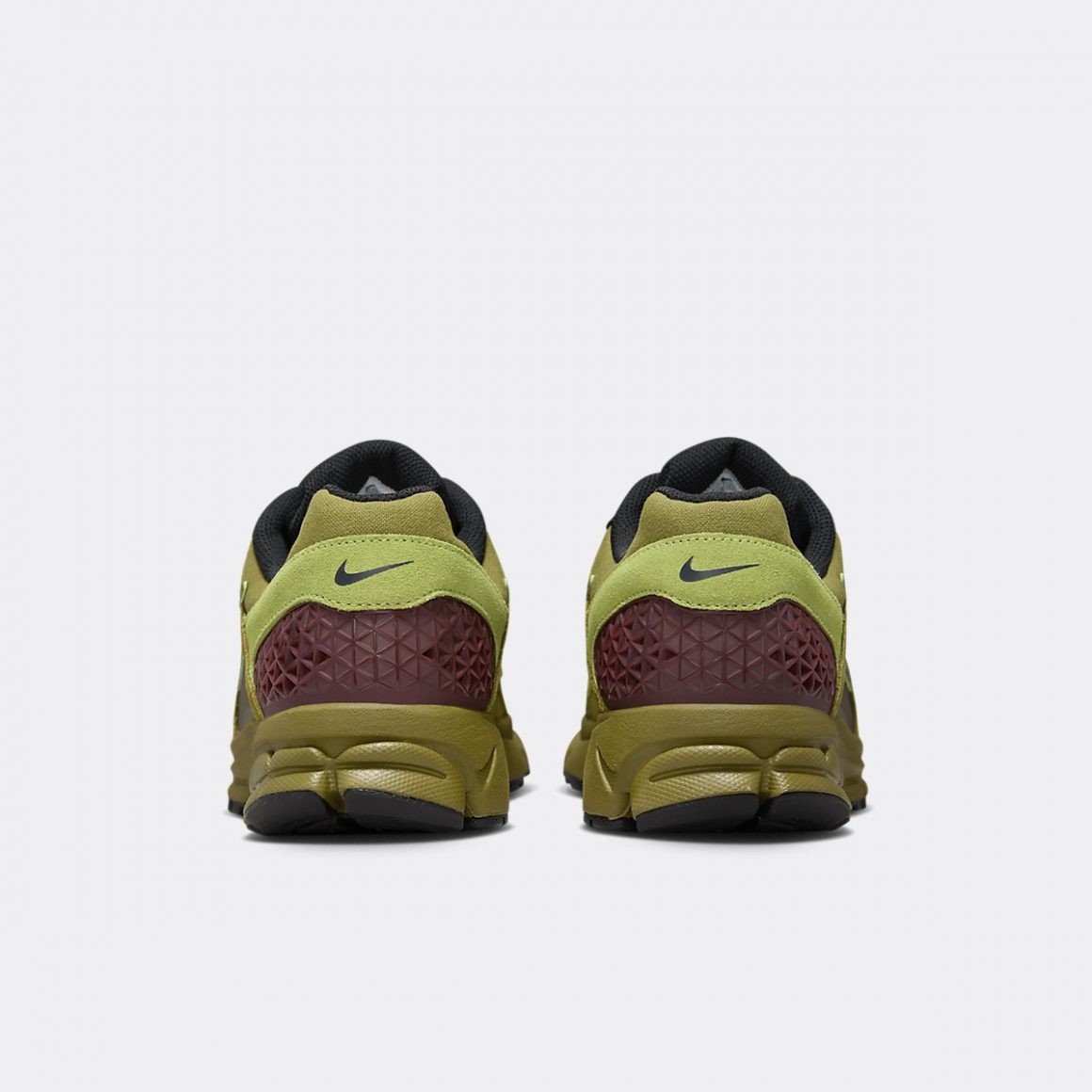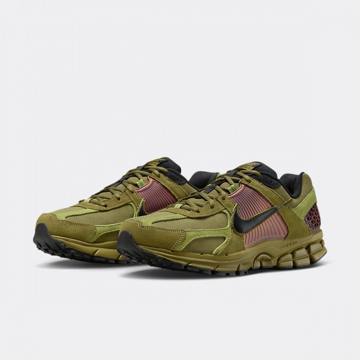 La silhouette basse et racée de la Nike Zoom Vomero 5 Pacific Moss est un pêle-mêle de matériaux et de coloris. La base de l’empeigne est construite en canvas olive, visible sur la toebox et le col de cheville. Les passages de lacets et le garde-boue avant sont renforcés par des empiècements en cuir suédé kaki, contrastant avec le cuir suédé vert prairie des renforts de la toebox et du talon. Sur ce dernier, le cuir suédé est serti d’un mini Swoosh noir, rappelant le sockliner en mesh et le sommet de la languette. Celle-ci porte une inscription kaki au nom du modèle. Les panneaux latéraux s’habillent de TPU strié bronze et légèrement irisé, sublimé par un Swoosh en cuir noir. Le TPU au talon s’habille de motifs grillagés et reprend le coloris bronze des panneaux latéraux. La paire bénéficie d’un amorti Zoom sur la semelle intermédiaire olive et repose sur une semelle extérieure noire.