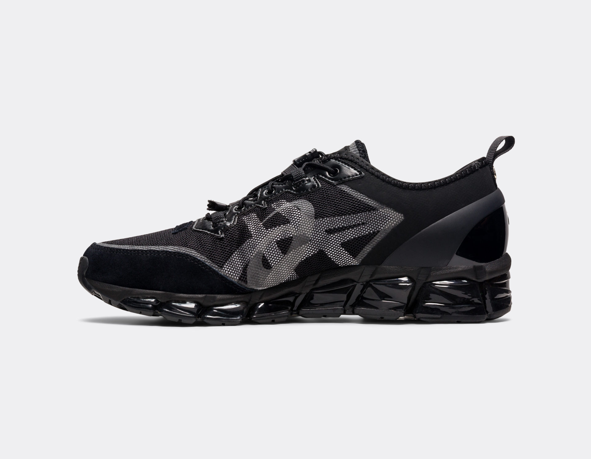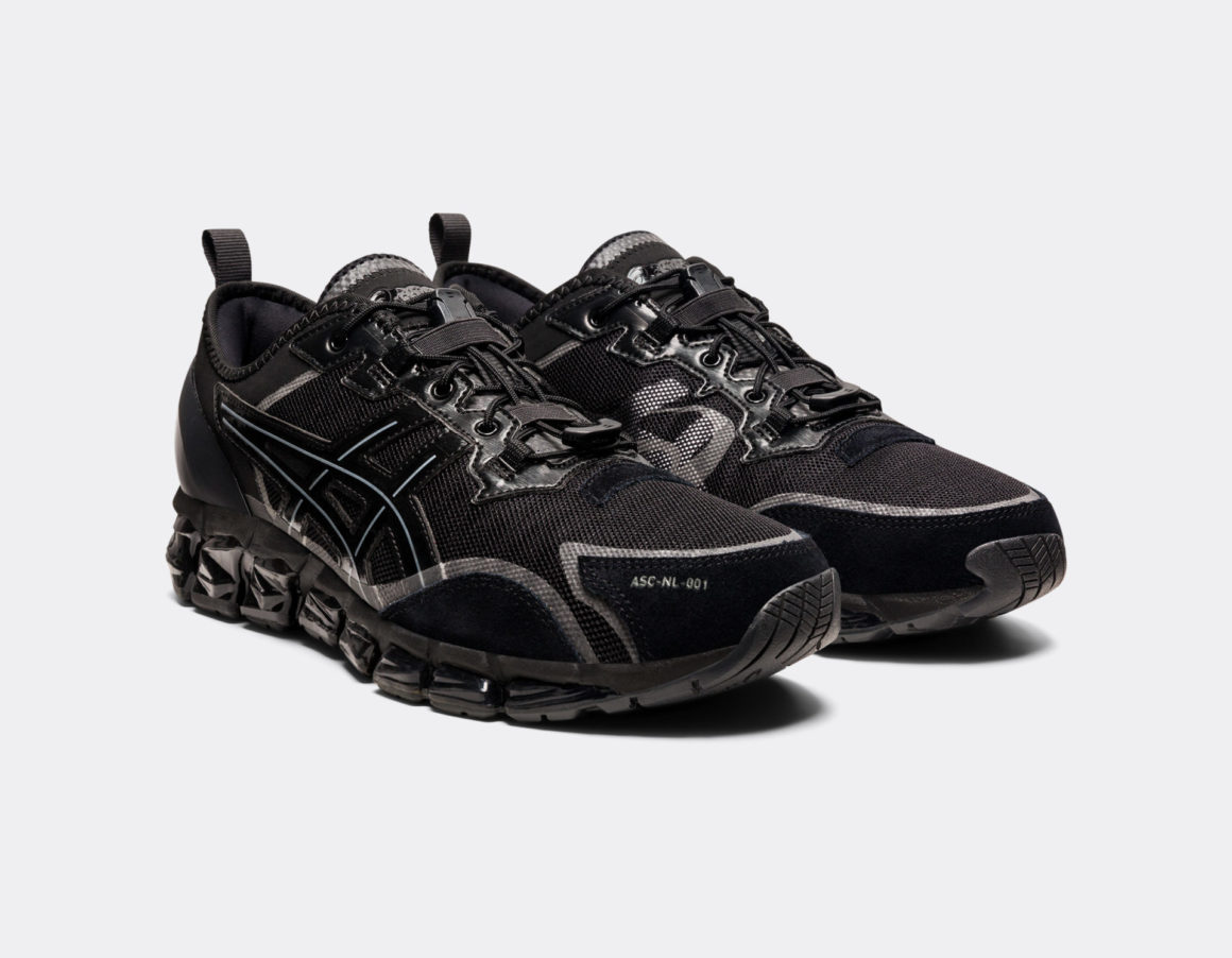 L’empeigne de cette Gel Quantum arbore un look total noir, mais est truffée de détails. Si la première base est faite de mesh, on retrouve également des empiècements en cuir sur les passages des lacets ainsi que du cuir suédé pour renforcer l’avant et les côtés de la paire. Les Tiger Stripes sont en cuir fin lisse et sont cousus sur l’empeigne. Le talon est quant à lui soutenu par une pièce en TPU, surmonté par un empiècement en Néoprène pour assurer le confort de la sneaker au look futuriste. Sur le côté intérieur de la paire, on retrouve les Tiger Stripes imprimés d’argent ainsi qu’un logo Asics en superposition. La semelle structurée de la Gel Quantum 360 est ici habillée de noir verni pour compléter la silhouette monochrome. Autre originalité, les lacets fins sont maintenus par un lacelock noir, ce qui renforce le look technique de la sneaker. La collaboration est signée sur une pièce métallique ronde sous la tirette du talon où on observe le nom de Nu Label.