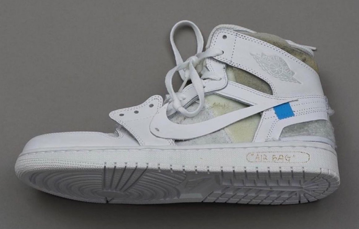 Pour cette version de 2025, la Off-White x Air Jordan 1 High OG conserve les codes esthétiques de la collaboration originale, tout en apportant des détails revisités. La tige de la sneaker est principalement composée de cuir blanc premium, offrant une allure propre et minimaliste. Ce cuir lisse contraste avec des empiècements en suede gris clair sur le garde-boue arrière et les panneaux latéraux, ajoutant une touche de texture subtile. On retrouve également des inserts en mesh légèrement translucide au niveau de la toebox, rappelant la volonté d’Abloh de dévoiler les couches de construction de la chaussure, un élément clé de l’approche déstructurée de son travail. La touche Off-White se manifeste aussi par la présence de coutures zigzag apparentes sur certaines parties de la tige. Le Swoosh immaculé est maintenant par une couture platine à l’avant et un empiècement bleu à l’arrière. Il est surmonté par un Wings logo en ton sur ton, assorti à la semelle intermédiaire. Cette dernière porte l’inscription “AIR BAG » en lieu et place des habituelles inscriptions de Virgil. On retrouve également les annotations imprimées sur la partie interne de la chaussure, indiquant l’origine et l’année de la création de la sneaker.