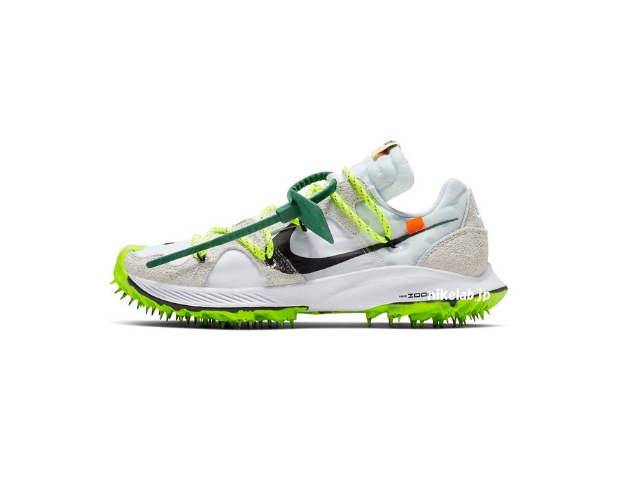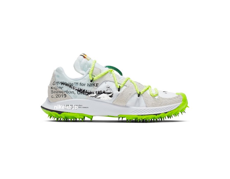 Pour sa collection d’été 2019, c’est sur le domaine du trail running que Virgil Abloh et Nike se retrouvent. Cette fois-ci c’est le modèle Nike Air Zoom Terra Kiger 5 qui est revue de façon premium à la sauce Off-White. On retrouve les éléments qui font le succès des collaborations entre le label streetwear et la marque de l’Oregon. En effet, ces sneakers disposent des serflex plastiques attachés aux lacets, de languettes surdimensionnées et d’ inscriptions sur l’intérieur de la paire, comme sur les sneakers de la série The Ten. Enfin, chacune des paires dispose de crampons pour ajouter un aspect original à cette création.