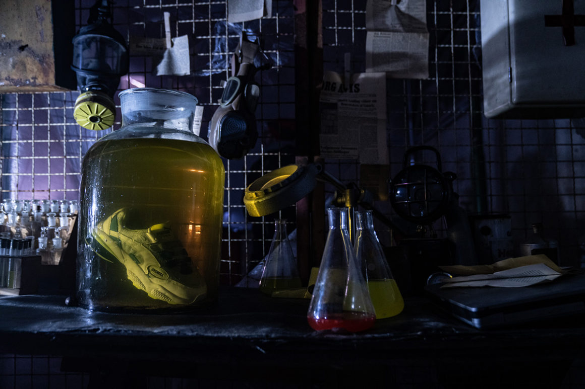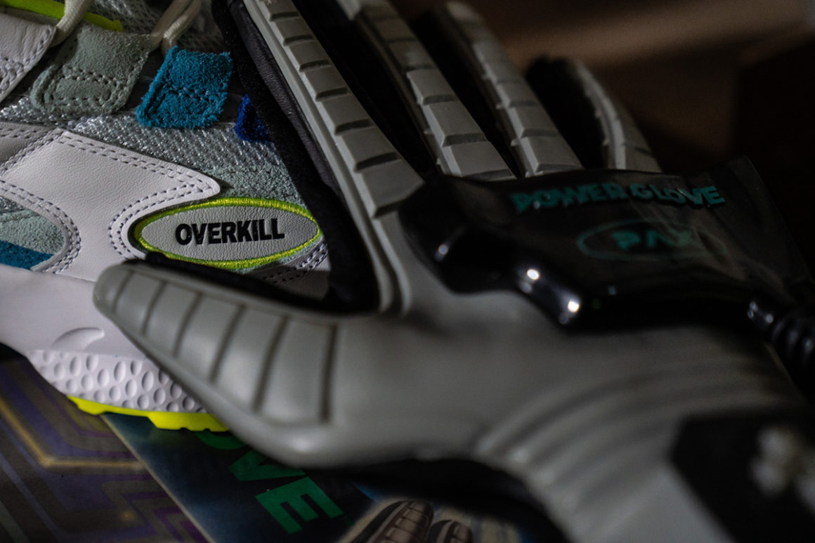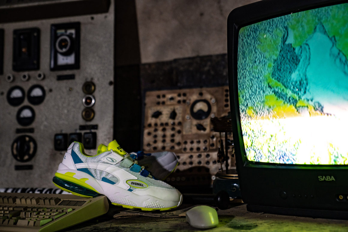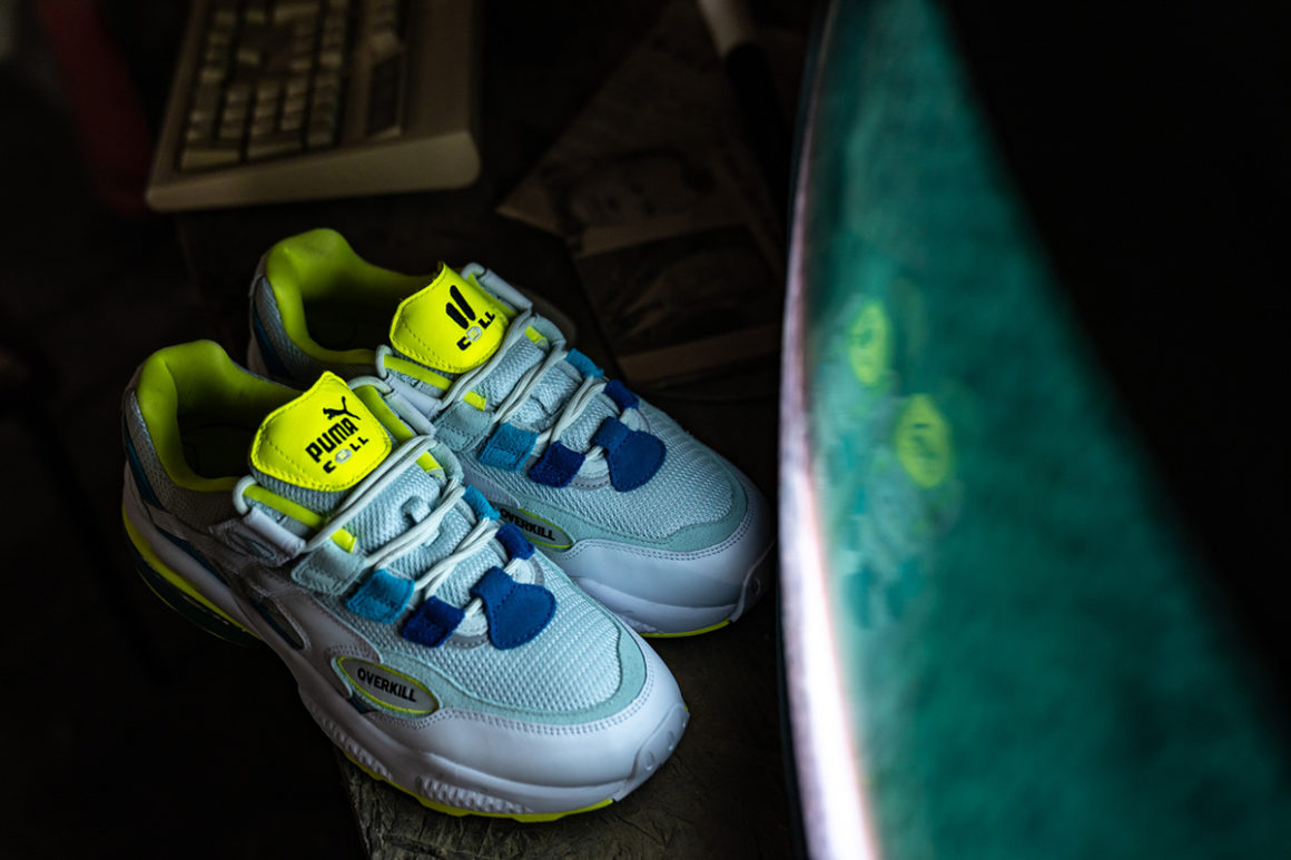 Apparue en 1998, la Puma Cell Venom propose alors un look très futuriste. On retrouve en effet une silhouette relativement imposante qui s’inscrit parfaitement dans la tendance de la « chunky sneaker ». Relancée en fin d’année dernière pour le 20ème anniversaire du modèle, les équipes chargées du design de la firme allemande ont proposé de nombreux coloris et collaborations. Pour cette version « Radiant Venom », la team Overkill a opté pour une empeigne majoritairement blanche et grise. De nombreux détails jaune fluo apparaissent sur la paire et font référence à la radioactivité. En effet, la languette, une partie de la semelle et la doublure intérieure sont présentées dans cette teinte flashy. On retrouve des touches de bleu sur les passants des lacets ainsi que sur une petite partie de la tige. La bulle de la semelle est également dans une teinte vert d’eau. Le logo Overkill remplace l’habituel logo Puma sur les profils de la paire. Enfin, les logos des deux marques figurent sur la semelle intérieure et un symbole radioactif nous rappelle une fois de plus l’origine du thème.