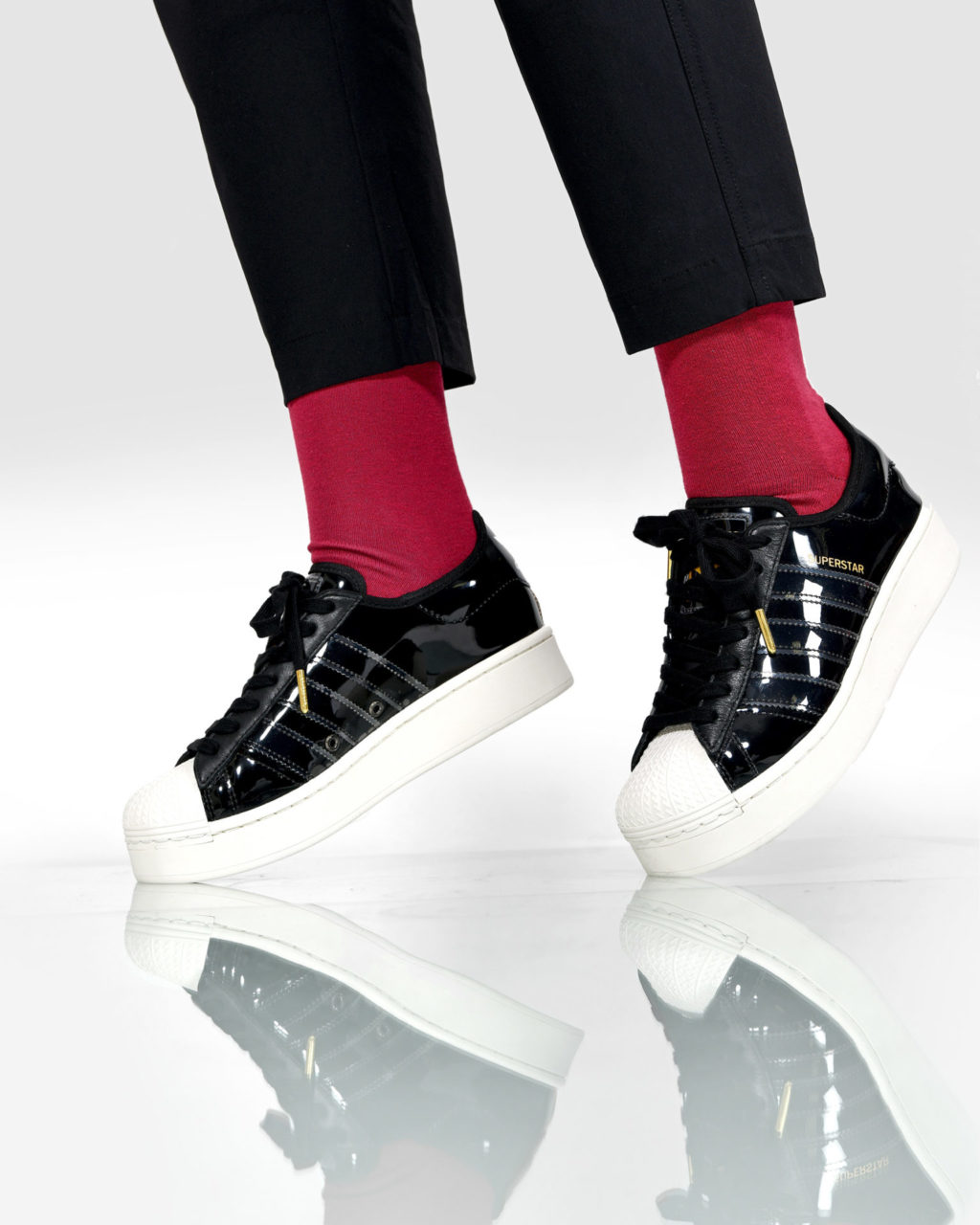 L’ADN du modèle d’origine est conservé tout en étant réinterprété de façon moderne. Les clichés présentent une sneaker en version Platform, avec une semelle compensée qui intègre toujours sur la toebox le fameux shell-toe. Autre originalité : l’utilisation d’une tige basse proposée dans une conception en TPU complètement transparente. Elle remplace le cuir habituellement utilisé sur cette sneaker depuis ses débuts, et offre ainsi une sneaker originale et un poids plume sur la balance. Le matériau très brillant offre ainsi un côté feutré à la sneaker tout comme l’inscription Superstar en lettrage doré. Les deux coloris présentés sont Core Black/Off White, une empeigne principalement noire avec une semelle et d’autres éléments blancs. Le second colorway Cloud White/Core Black est dominé par la transparence de la tige, une semelle blanche ainsi qu’une touche noire au talon. L’ajout de semelles de propreté noires sur les deux modèles offre un contraste intéressant grâce à la transparence de la tige.